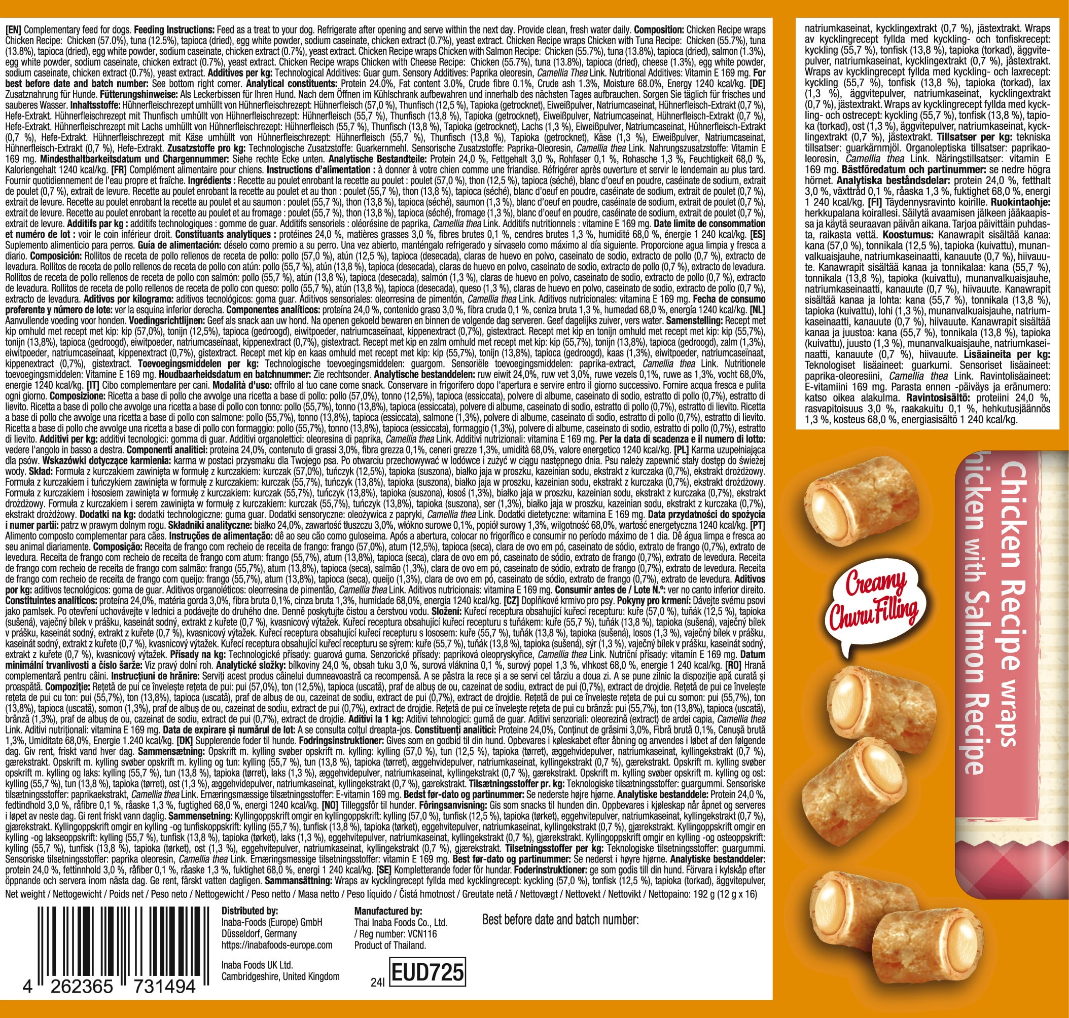 58,2 % Hühnerfleisch, 16,3 % Thunfisch, Tapioka getrocknet, Eiweiß, Natriumcaseinat, 0,9 % Lachs, Hühnerfleisch-Extrakt, Hefe, Grüntee Extrakt