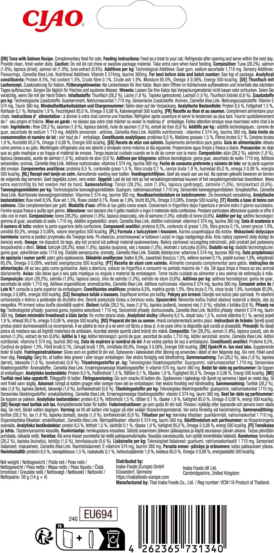 28,2 % Thunfisch, 1,8 % Lachs, Tapioka getrocknet, 1 % Lachsöl, 0,6 % Thunfisch-Extrakt