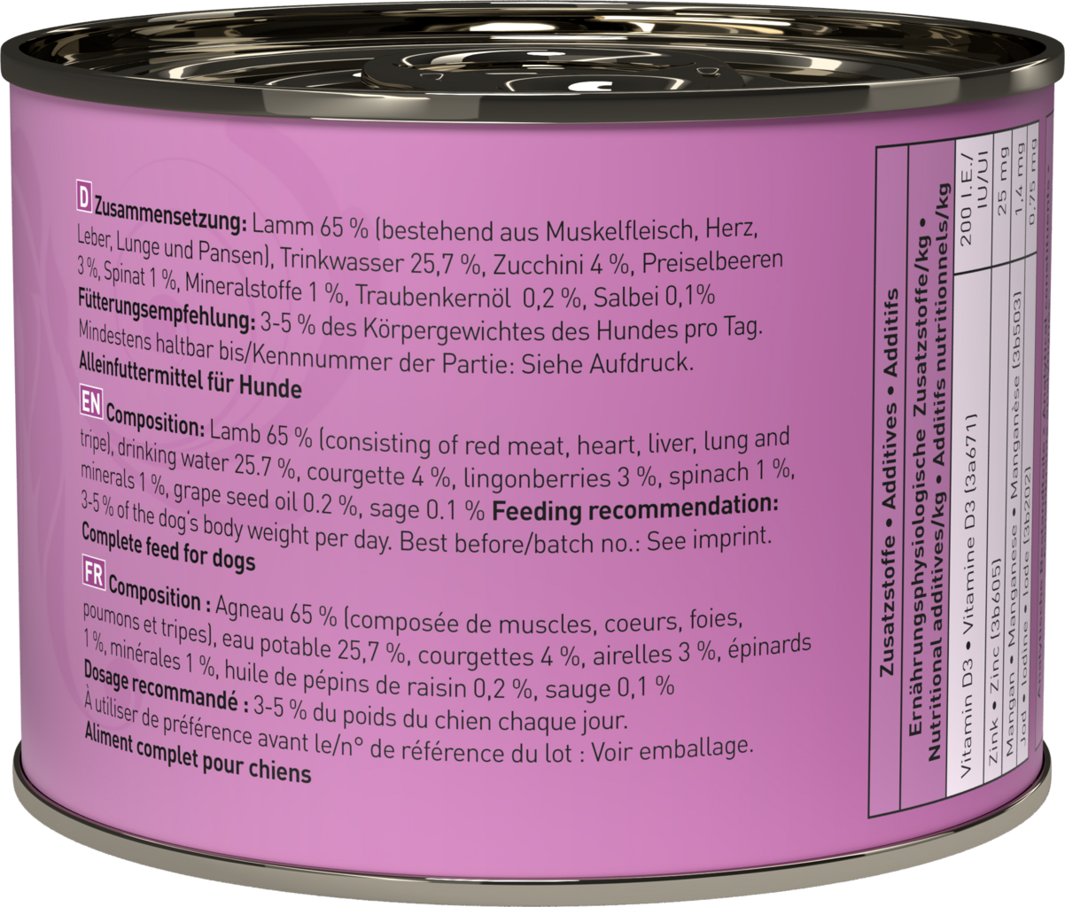 65 % Lamm (Muskelfleisch, Herz, Leber, Lunge, Pansen), 25,7 % Trinkwasser, 4 % Zucchini, 3 % Preiselbeeren, 1 % Spinat, 1 % Mineralstoffe, 0,2 % Traubenkernöl, 0,1 % Salbei