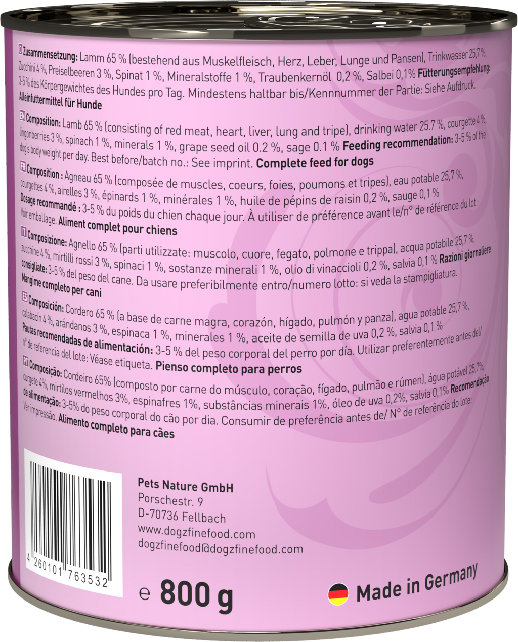 65 % Lamm (Muskelfleisch, Herz, Leber, Lunge, Pansen), 25,7 % Trinkwasser, 4 % Zucchini, 3 % Preiselbeeren, 1 % Spinat, 1 % Mineralstoffe, 0,2 % Traubenkernöl, 0,1 % Salbei