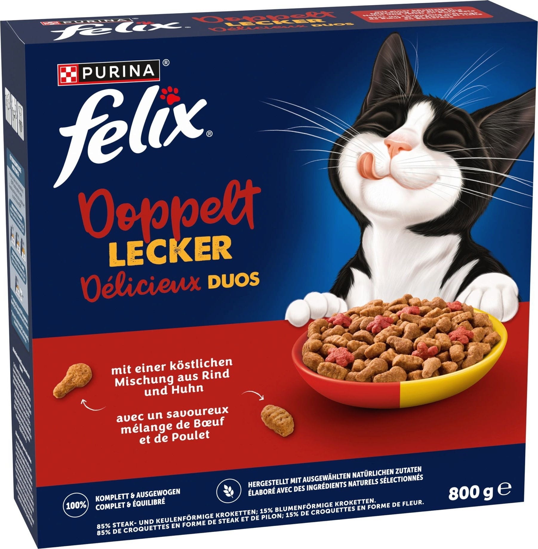 Warum nur eine Sorte wählen, wenn man beide haben kann? Mit FELIX Doppelt Lecker bringst du den ultimativen Mix in den Napf deiner Katze. Hier trifft saftiges Huhn auf herzhaftes Rind, verfeinert mit etwas Roter Bete. Das ist nicht nur eine Mahlzeit, das ist ein echtes Geschmacks-Feuerwerk für deinen vierbeinigen Liebling.