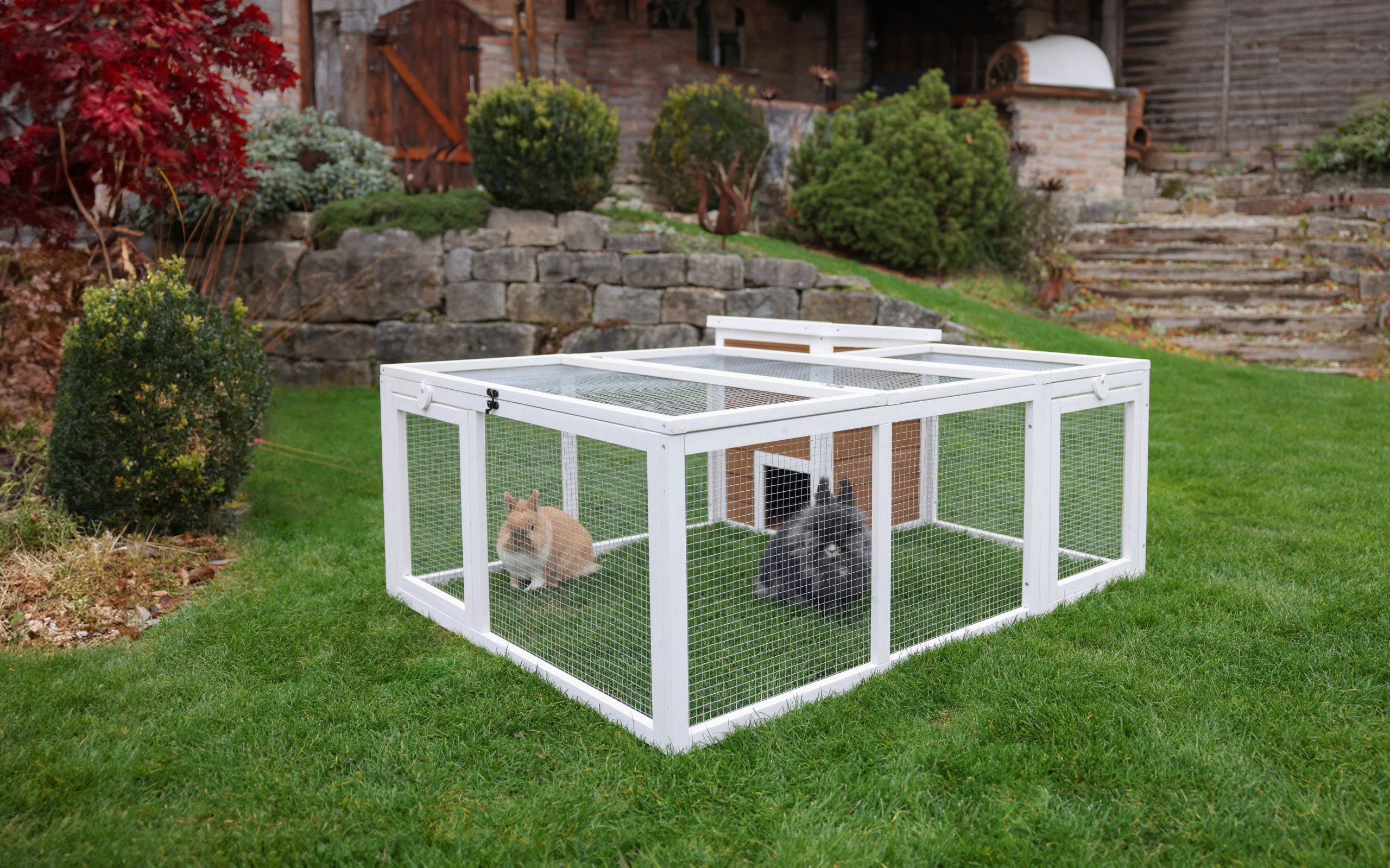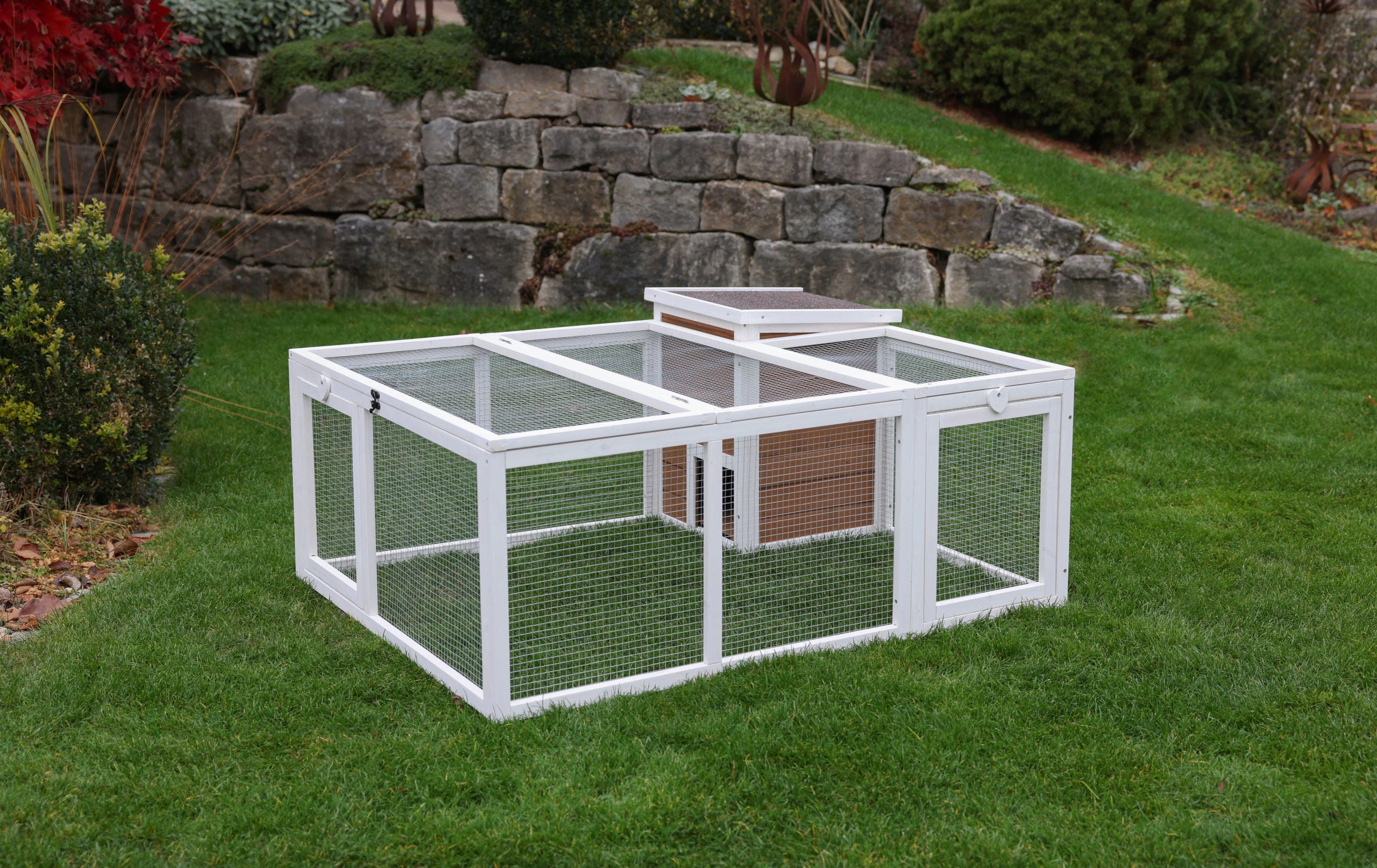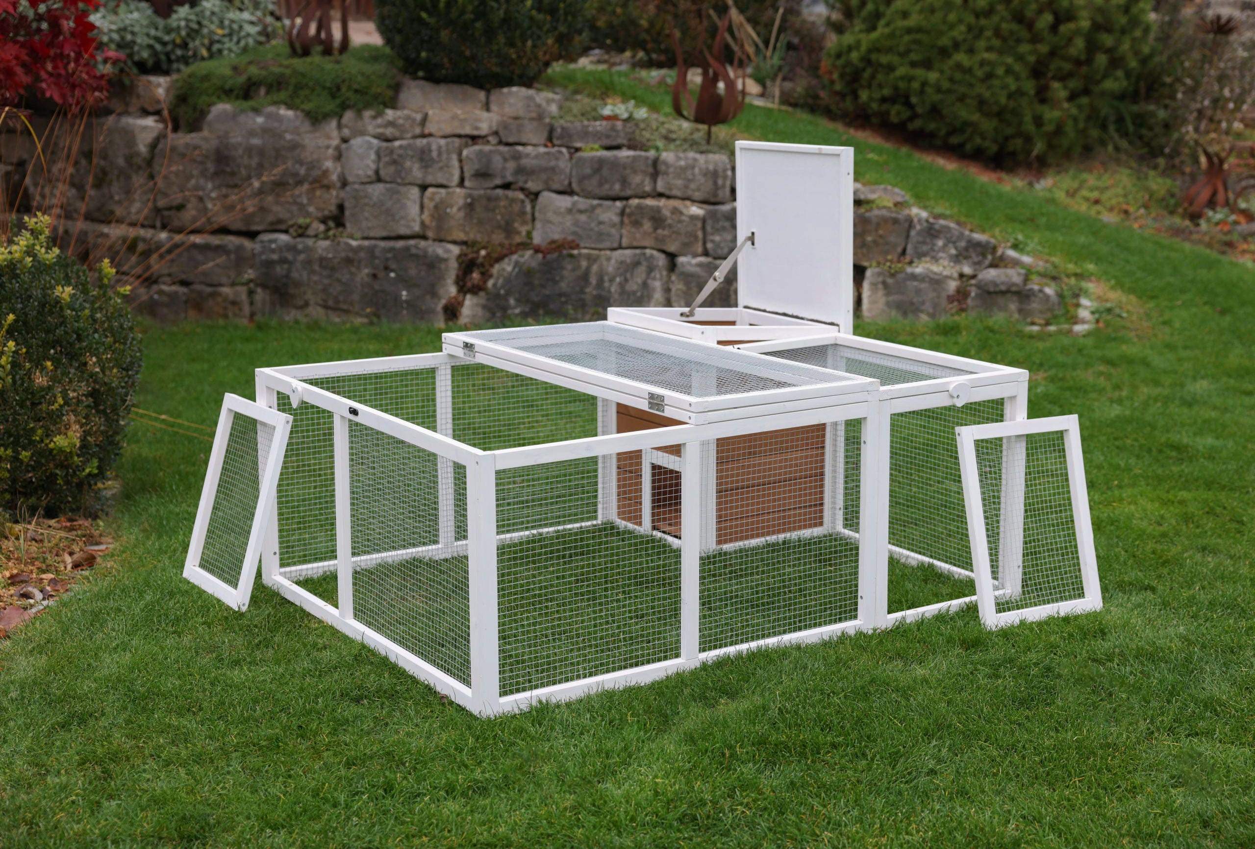 - Erweiterbares System: Durch spezielle Öffnungen an den Front- und Seitenelementen (Aussparungen: 34 x 44 cm) lässt sich problemlos ein Kaninchenstall direkt anbauen.