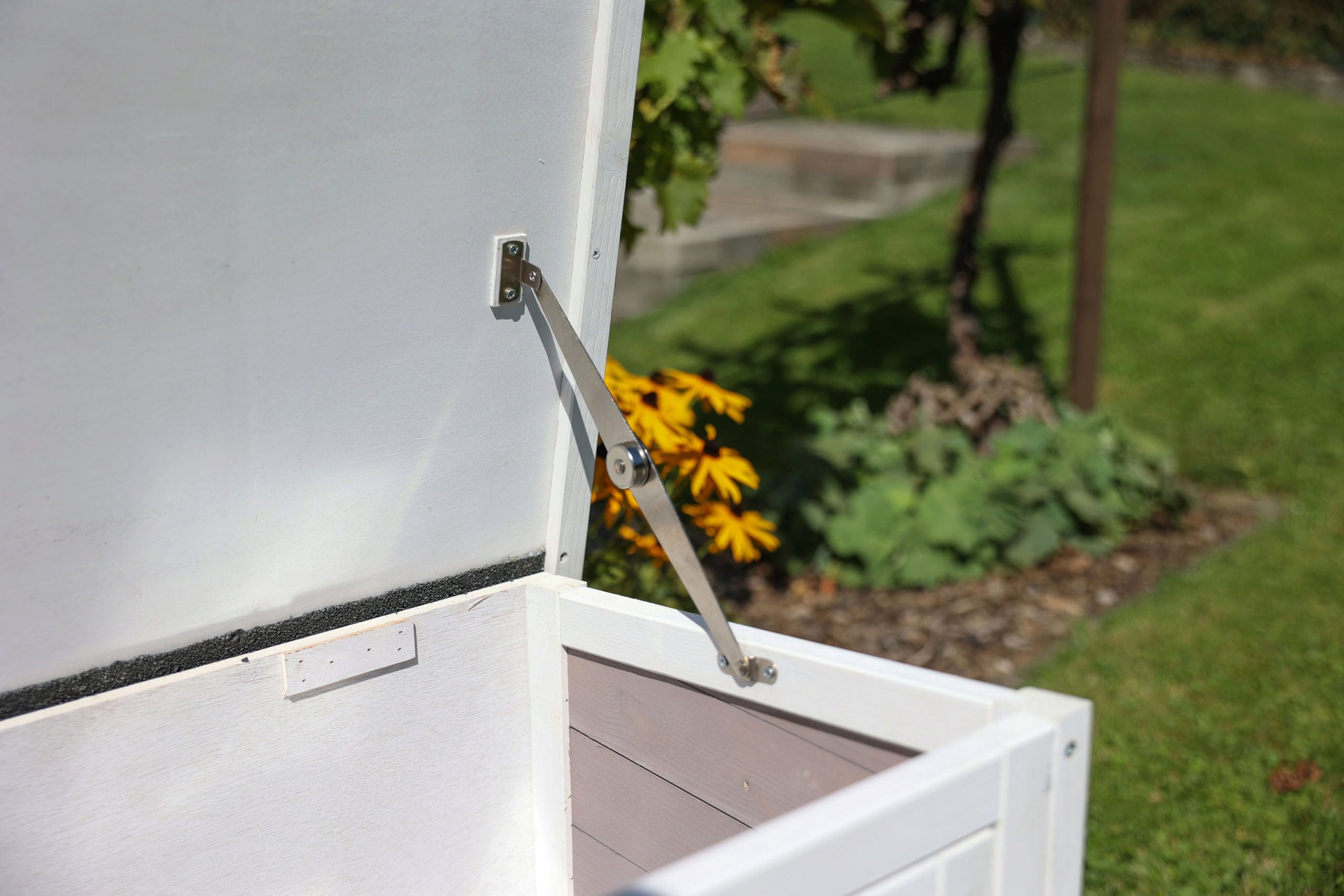 - Witterungsbeständiges Dach: Das aufklappbare Bitumendach schützt vor Regen und lässt sich dank der praktischen Dachfixierung für Reinigungsarbeiten sicher offen halten.