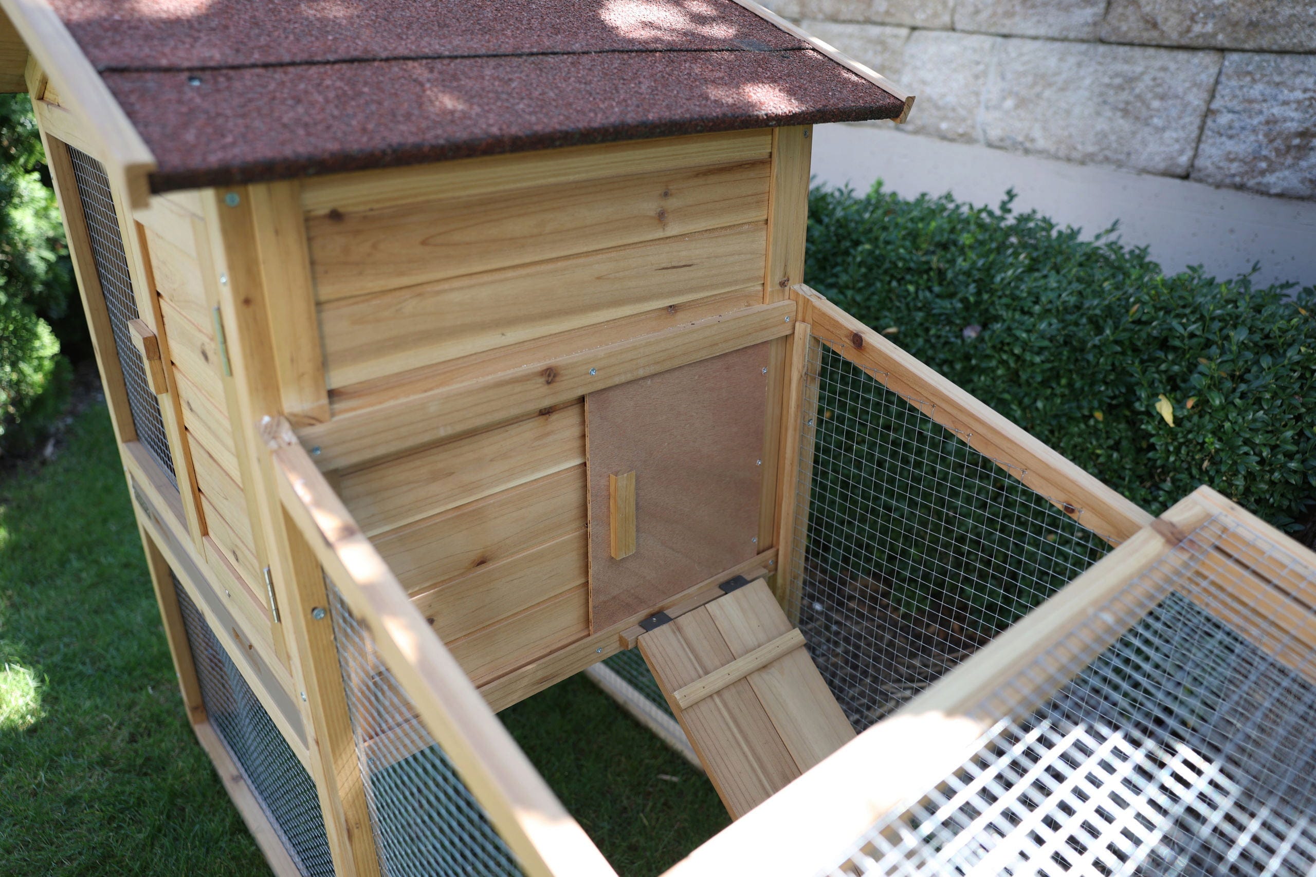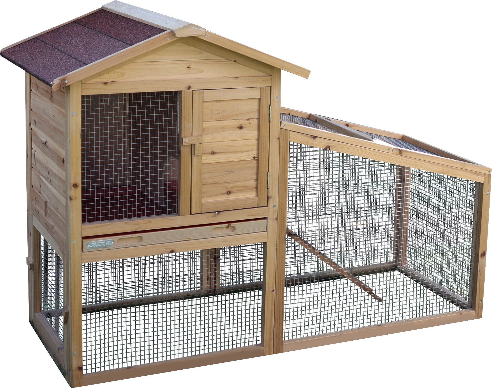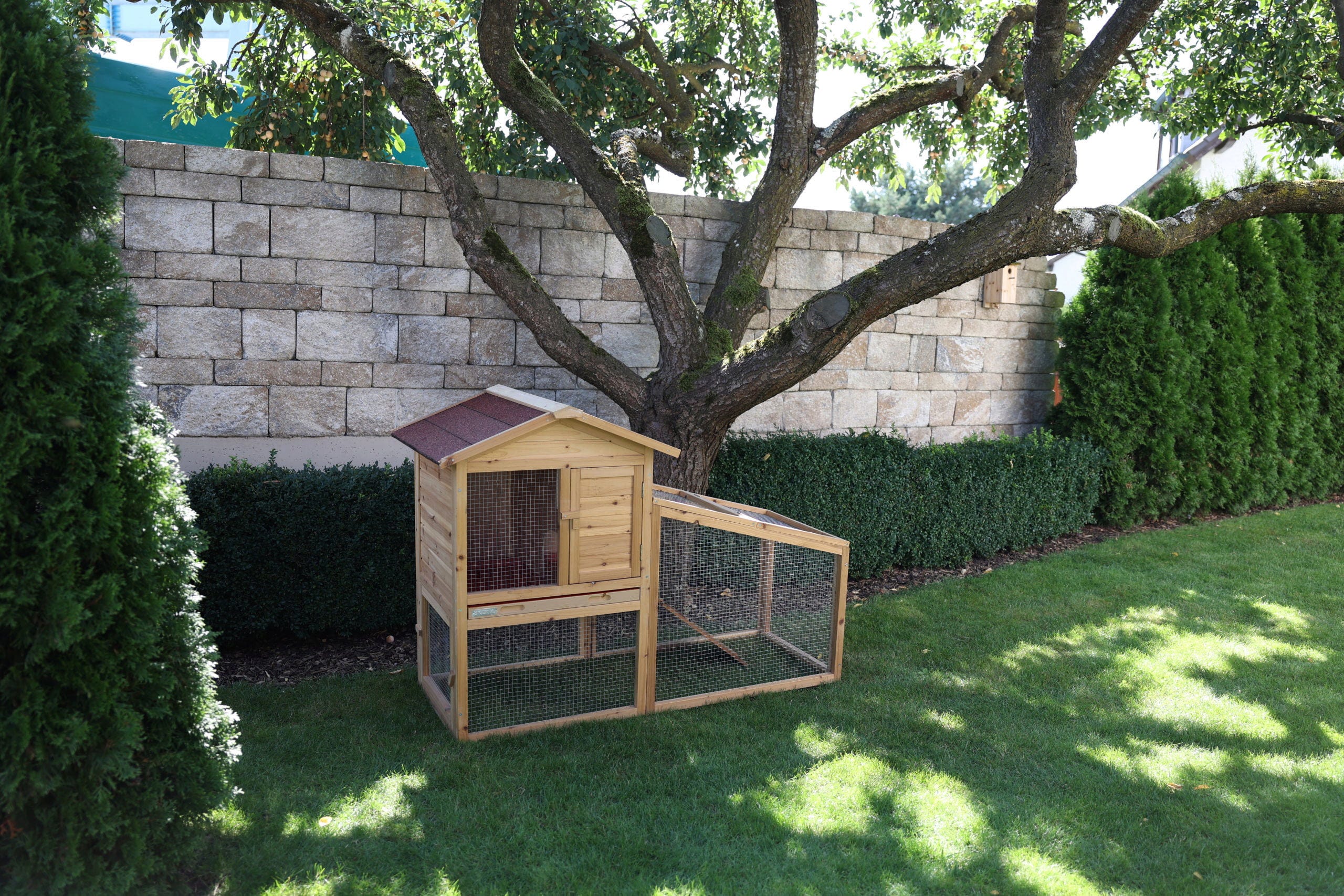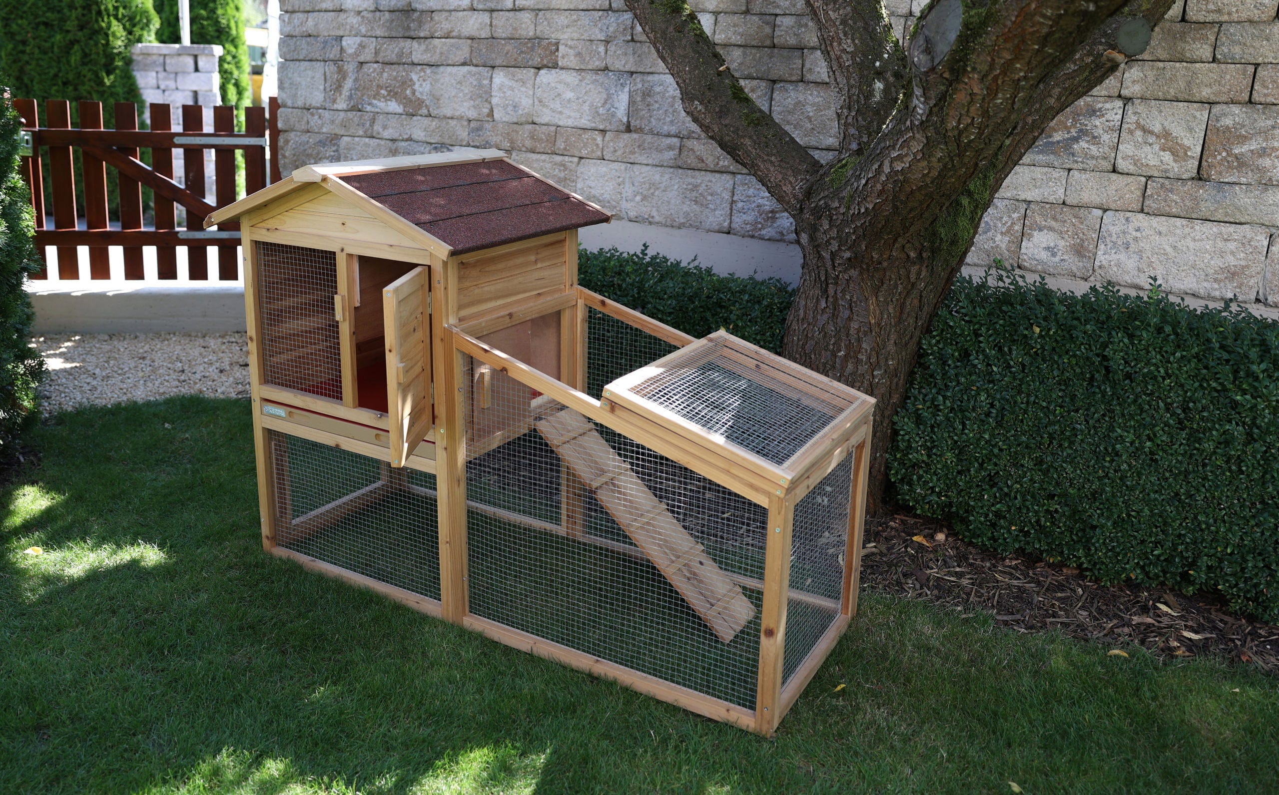 - Kombiniertes Gehege: Der Stall verfügt über einen direkten Auslauf, der den Tieren ausreichend Bewegung ermöglicht.