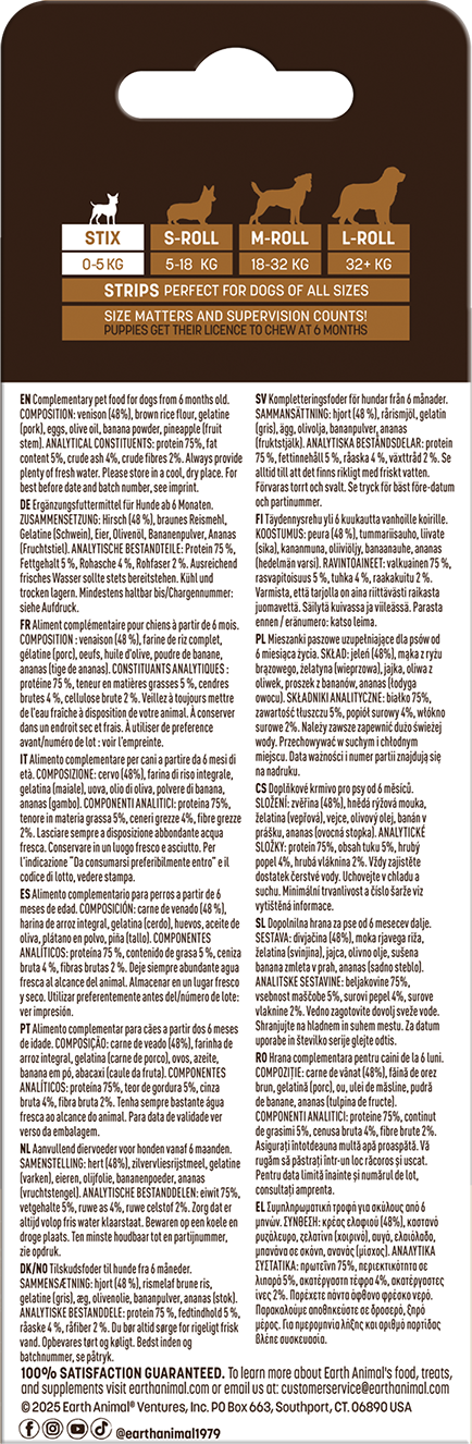 48 % Hirsch, braunes Reismehl, Gelatine (Schwein), Eier, Olivenöl, Bananenpulver, Ananas (Fruchtstiel)