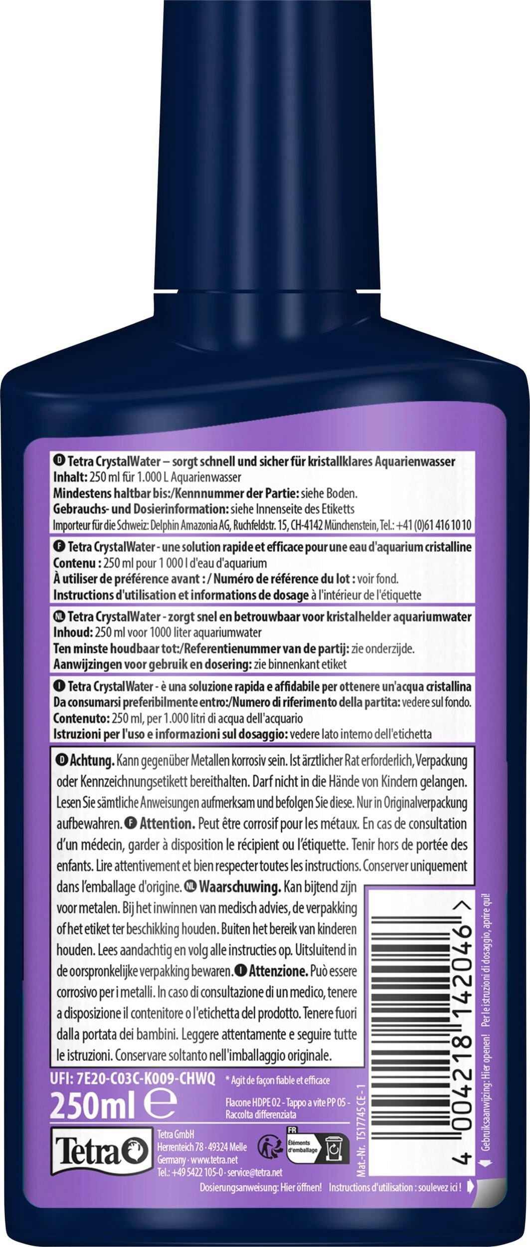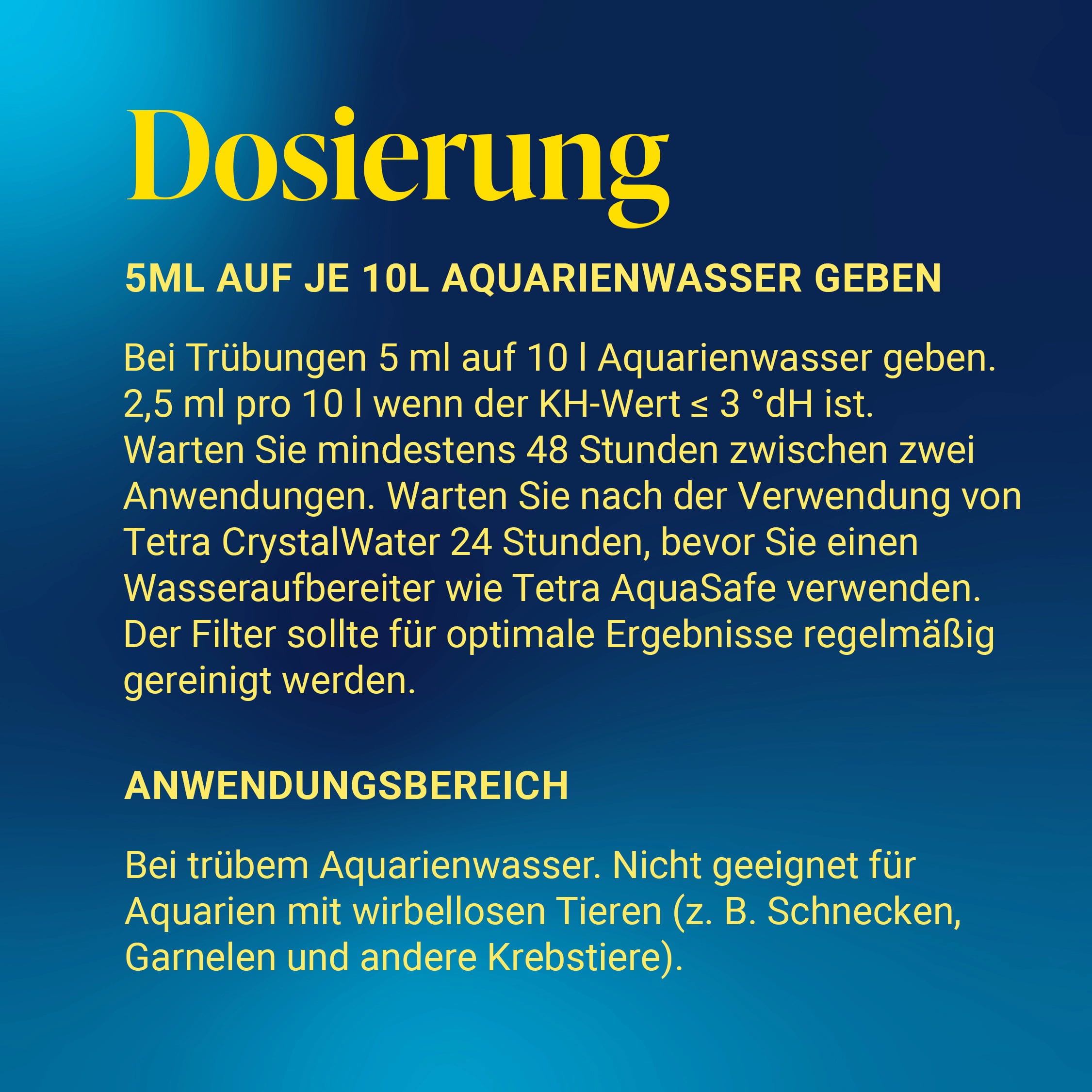 - Falls du zusätzlich einen Wasseraufbereiter wie Tetra AquaSafe nutzt, warte nach der Zugabe von CrystalWater bitte 24 Stunden, bevor du diesen anwendest.