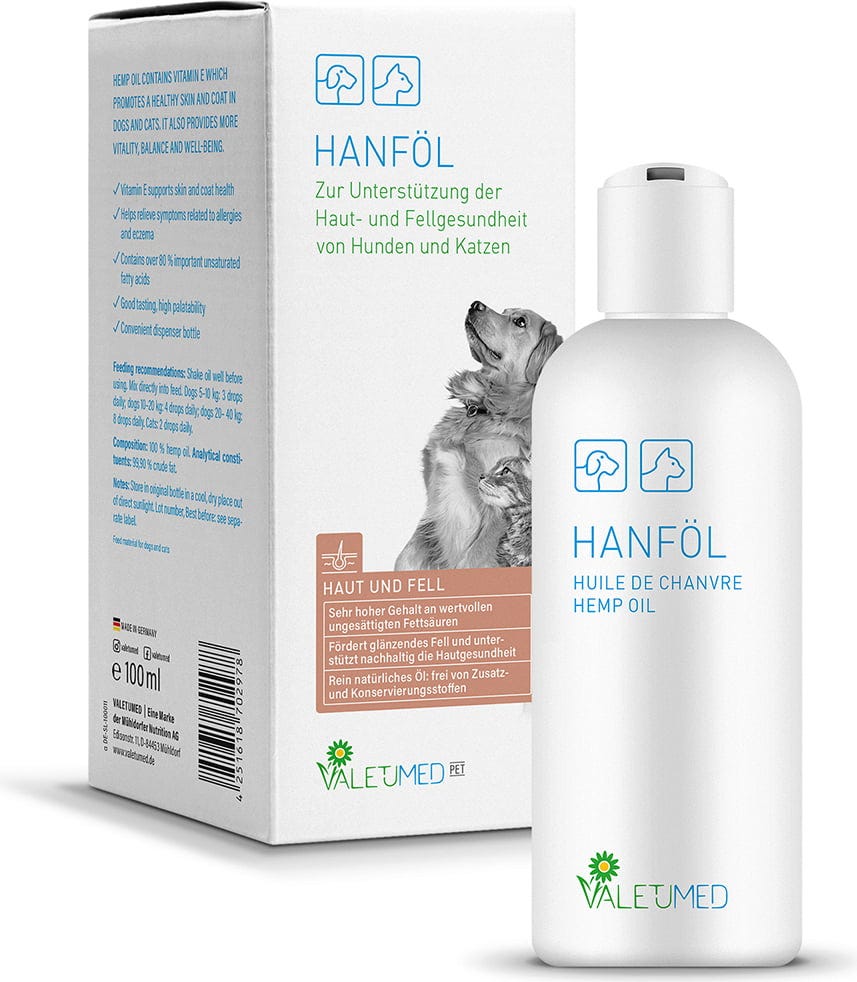 Valetumed Hanföl ist ein rein pflanzliches Einzelfuttermittel für Hunde und Katzen. Das naturreine Öl zeichnet sich durch einen hohen Gehalt an wertvollen ungesättigten Fettsäuren aus und dient als bedarfsgerechte, energetische Aufwertung der täglichen Futterration.