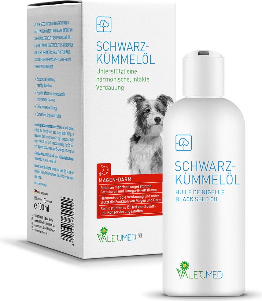 Das hochwertige Schwarzkümmelöl von Valetumed ist reich an wertvollen Pflanzenstoffen und ungesättigten Fettsäuren, die eine optimale Ergänzung für den täglichen Futterplans deines Hundes darstellen. Durch die naturreine Zusammensetzung kann dieses Öl dazu beitragen, die normale Verdauung und den Magen-Darm-Trakt deines Vierbeiners sanft zu unterstützen.