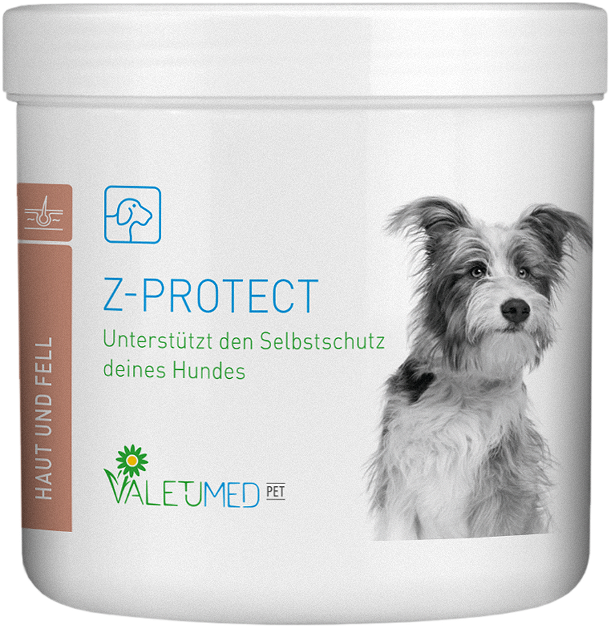 Das Ergänzungsfuttermittel Valetumed Z-Protect liefert deinem Hund eine speziell abgestimmte Nährstoffkombination, um die körpereigenen Prozesse von innen heraus zu begleiten. Der Fokus dieser Rezeptur liegt auf der ernährungsphysiologischen Unterstützung des Hautstoffwechsels und der allgemeinen Fellbeschaffenheit.