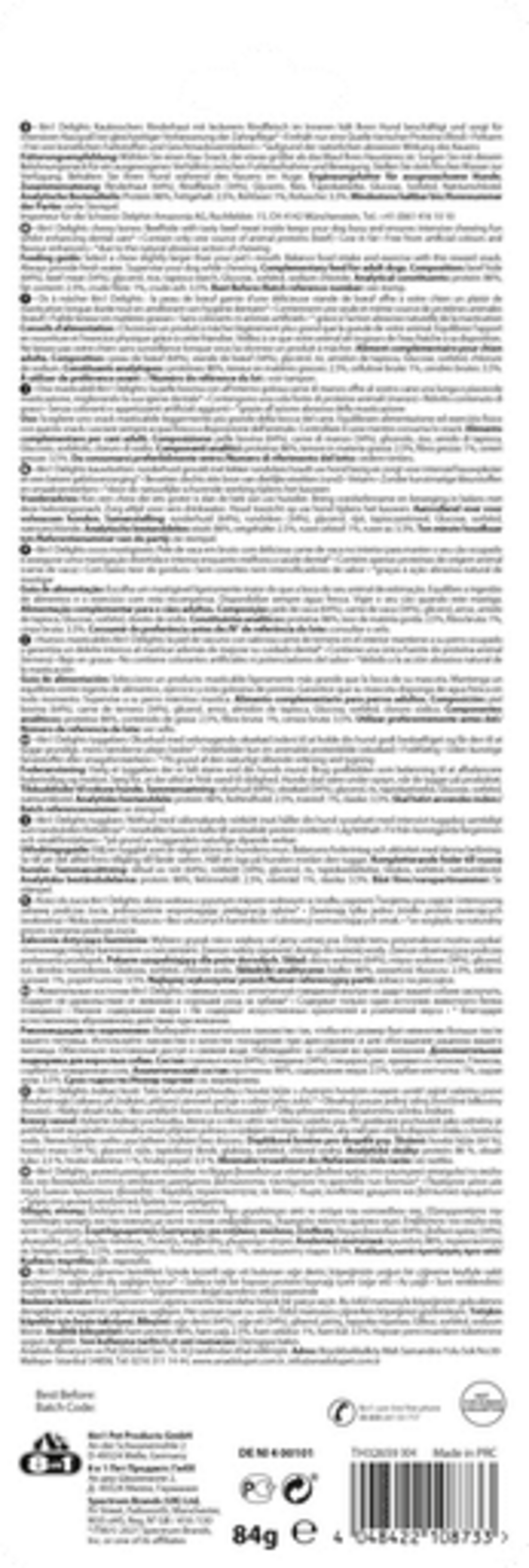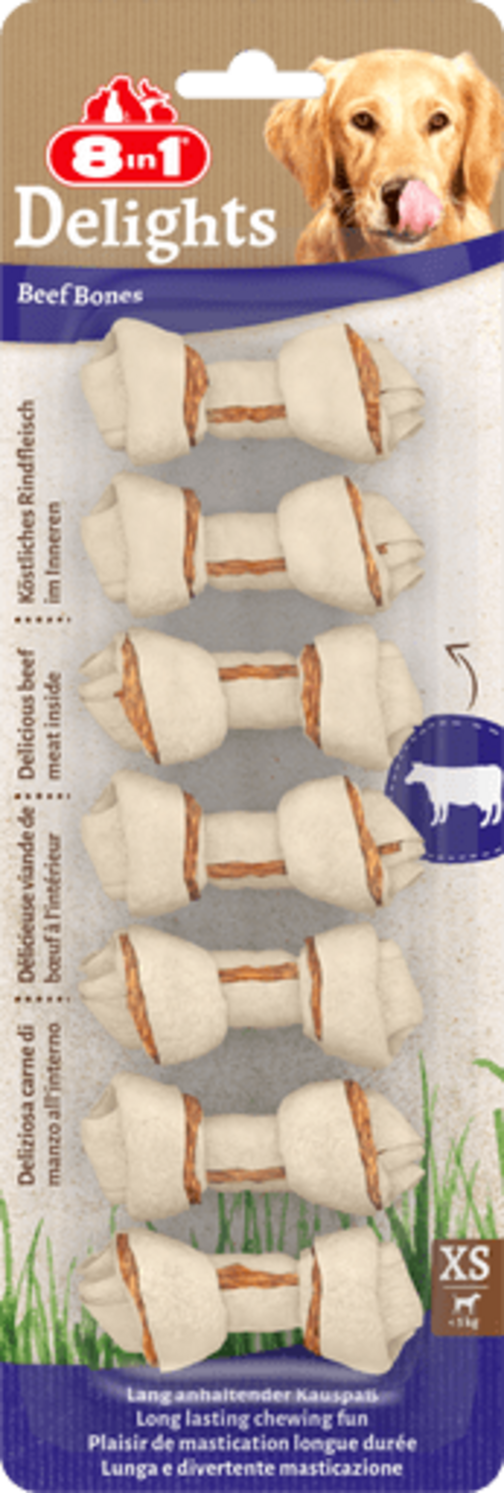 With the 8in1 Delights Beef Bones, you can satisfy your furry friend's need to chew and do something good for their teeth and oral hygiene at the same time. Coated in crispy beef skin, these tasty beef chews will not only tempt your four-legged friend's sense of smell but will also provide hours of chewing pleasure. While your furry friend chews on the snack, their teeth are mechanically rubbed down, tartar is removed and their chewing muscles are effectively exercised. All in all, a great snack that is a marvellous addition to daily feeding.