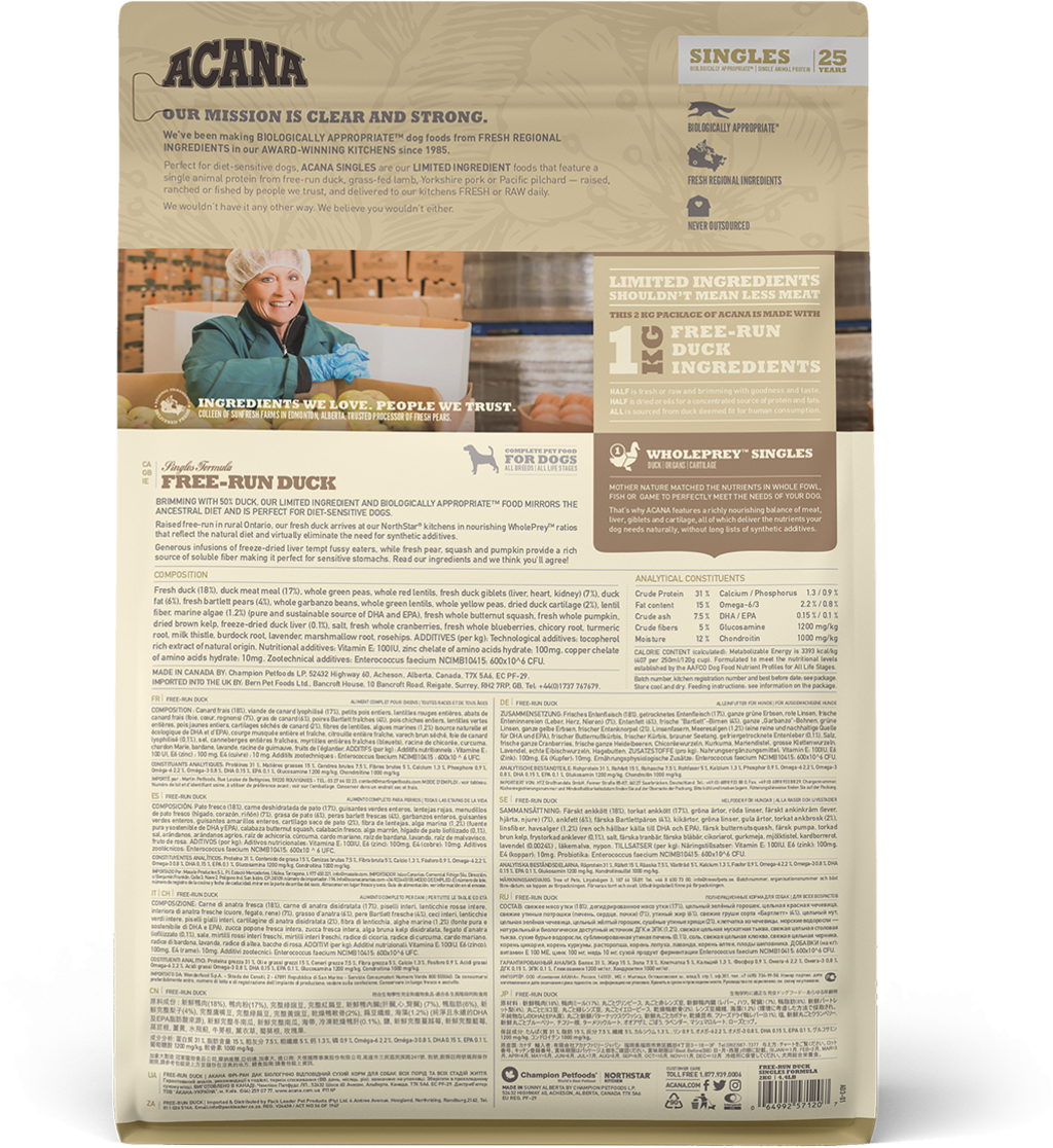 Looking for high-quality dog pet food with a simple yet packed formula? ACANA™ Free-Run Duck focuses on a few, yet select ingredients – with no compromise on quality. With 50% duck, including meat, organs, and bones following the WholePrey principle, it offers natural and balanced nutrition for your dog.