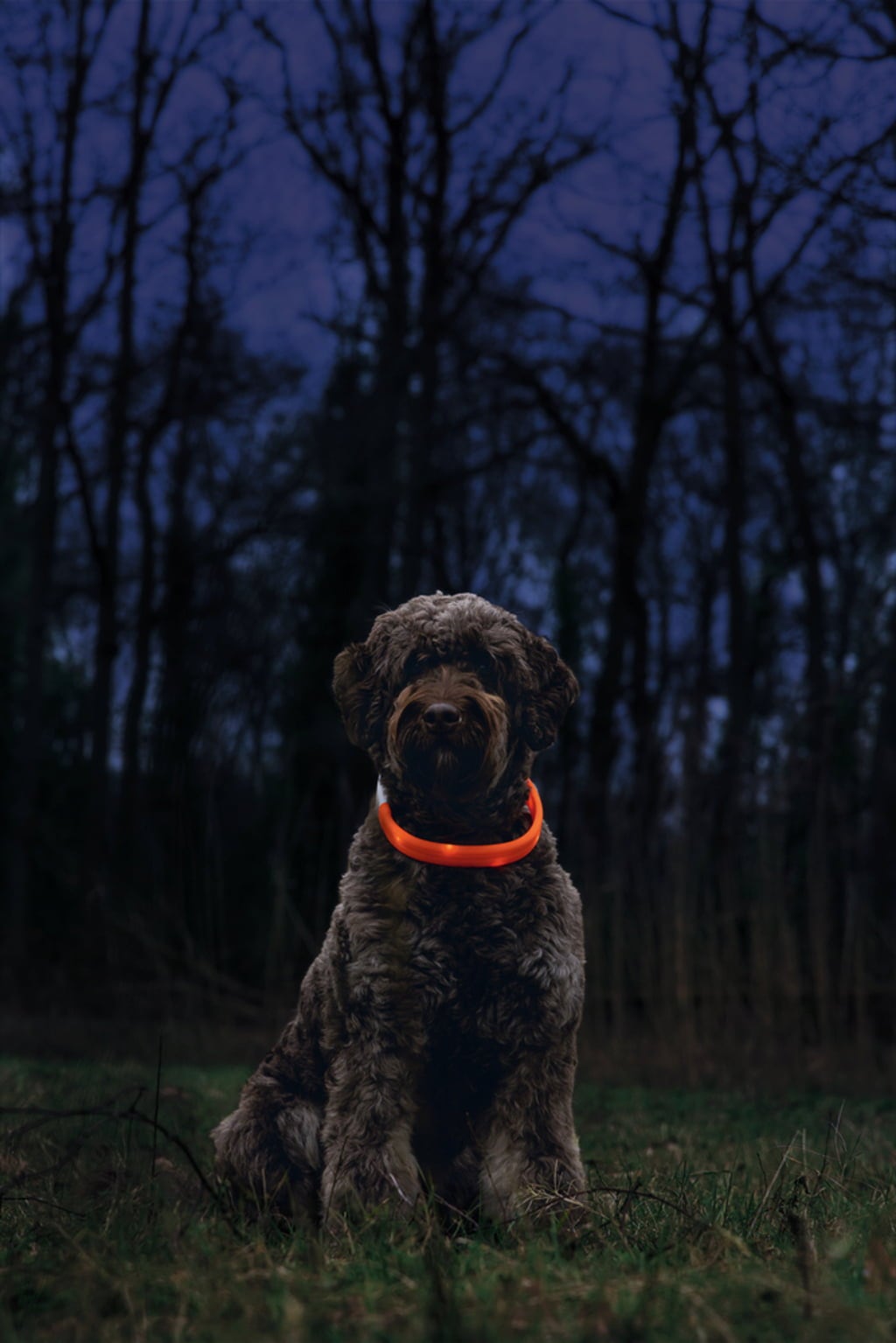 The Glowy Collar is waterproof and can be quickly and easily adjusted to the desired length, making it particularly ideal for long-haired dog breeds. Thanks to the included USB cable, recharging is a breeze. Simply plug in and charge – the collar is ready for your next evening walk.