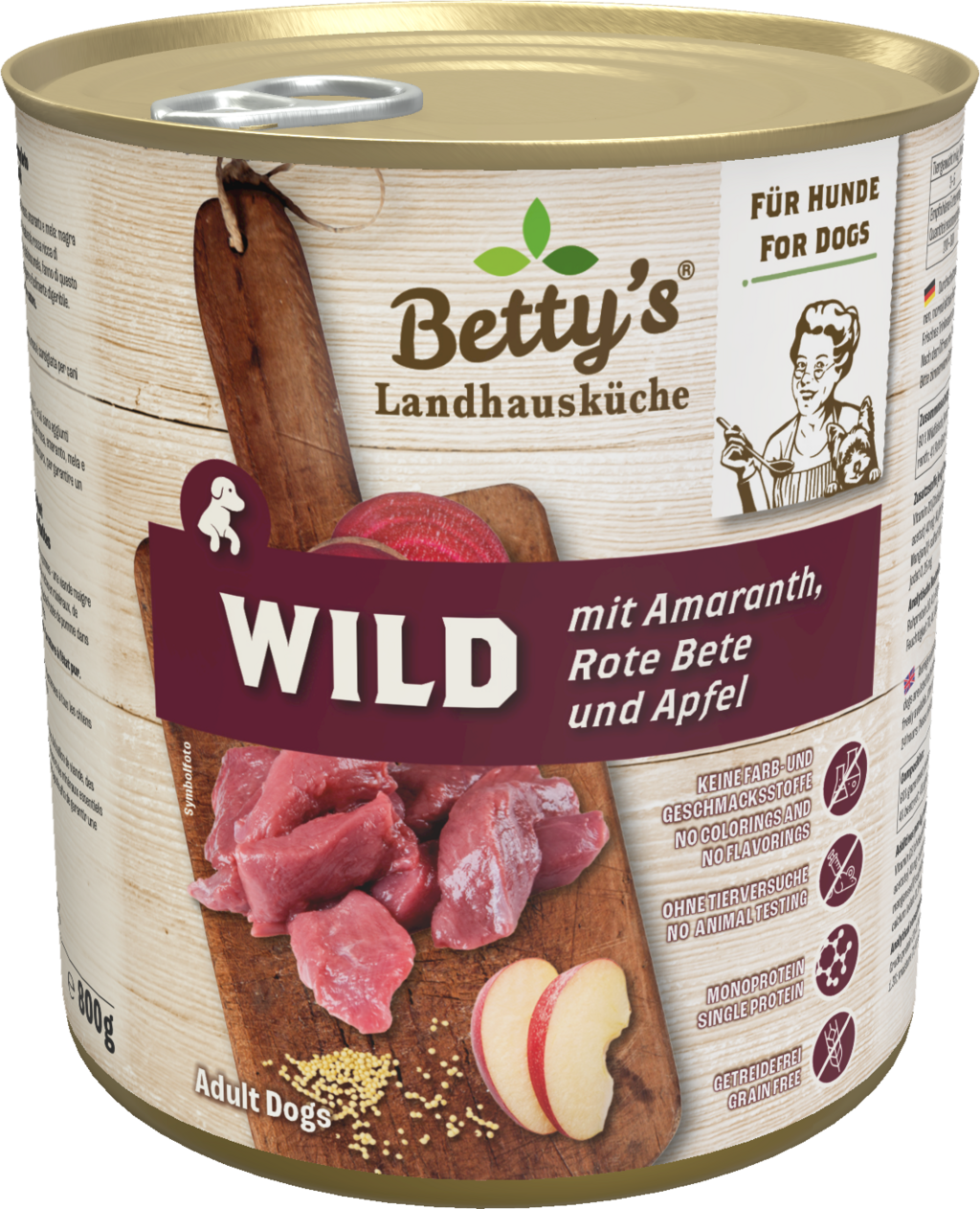 60 % Game meat (Deer, Wild boar), 25,8 % Broth, 5 % Amaranth, 4 % Beetroot, 4 % Apples, 1 % Minerals, 2 % Linseed oil