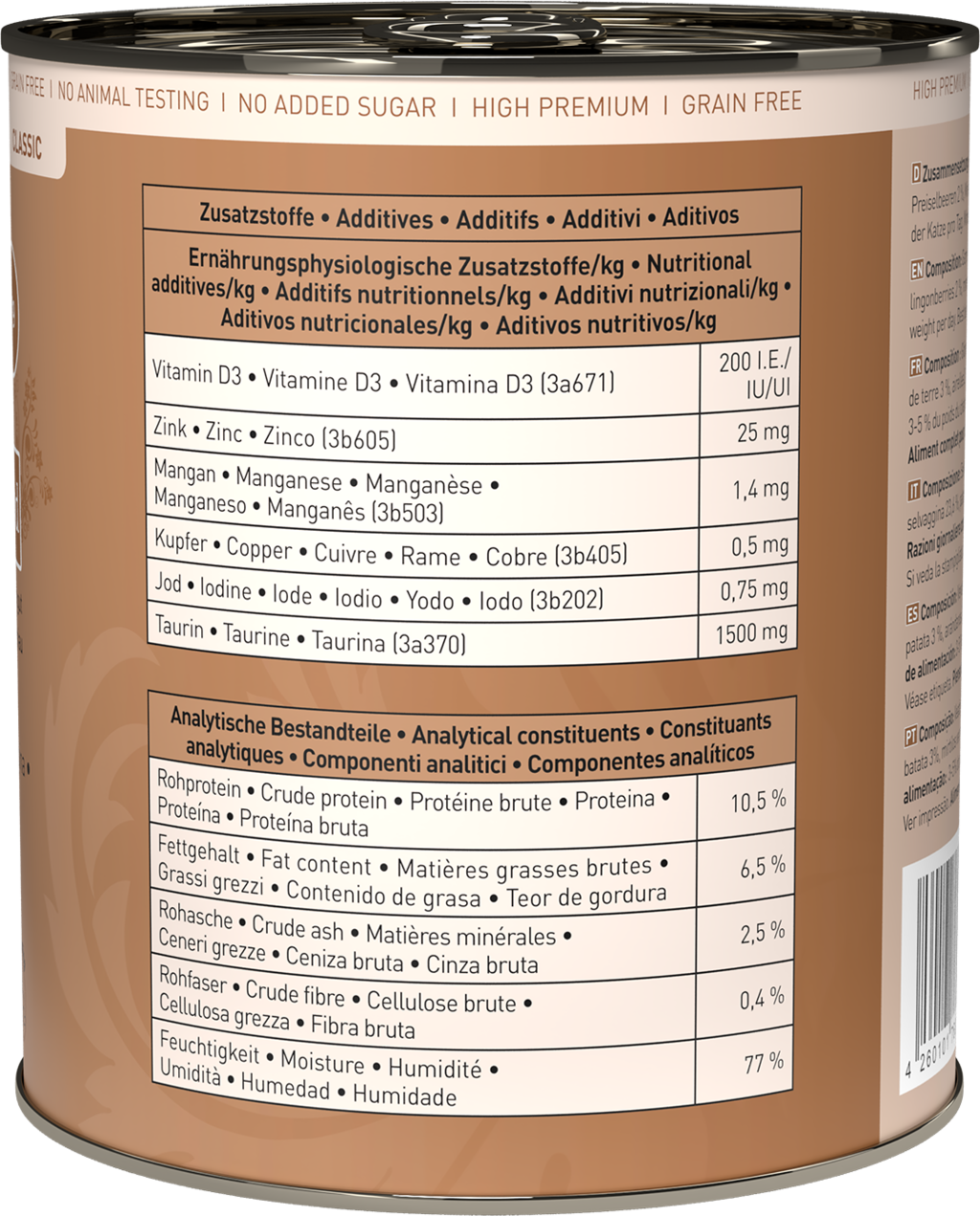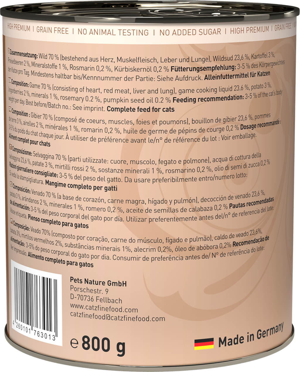 70 % Game (Heart, Muscle meat, Liver, Lung), 23,6 % Game broth, 3 % Potatoes, 2 % Cranberries, 1 % Minerals, 0,2 % Rosemary, 0,2 % Pumpkin seed oil
