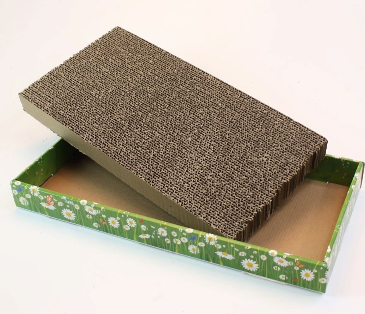 The rectangular scratching cardboard with catnip by Croci is the perfect accessory for any home with a scratch-happy cat! Its practical shape allows you to place the cardboard in any corner of the house; the cute daisy pattern makes it visually appealing too! It's not only attractive to look at – the included catnip will lure your cat and induce a euphoric state. This activates your cat's playful behaviour, encouraging their need for movement for a certain period. Beautiful and functional at the same time!