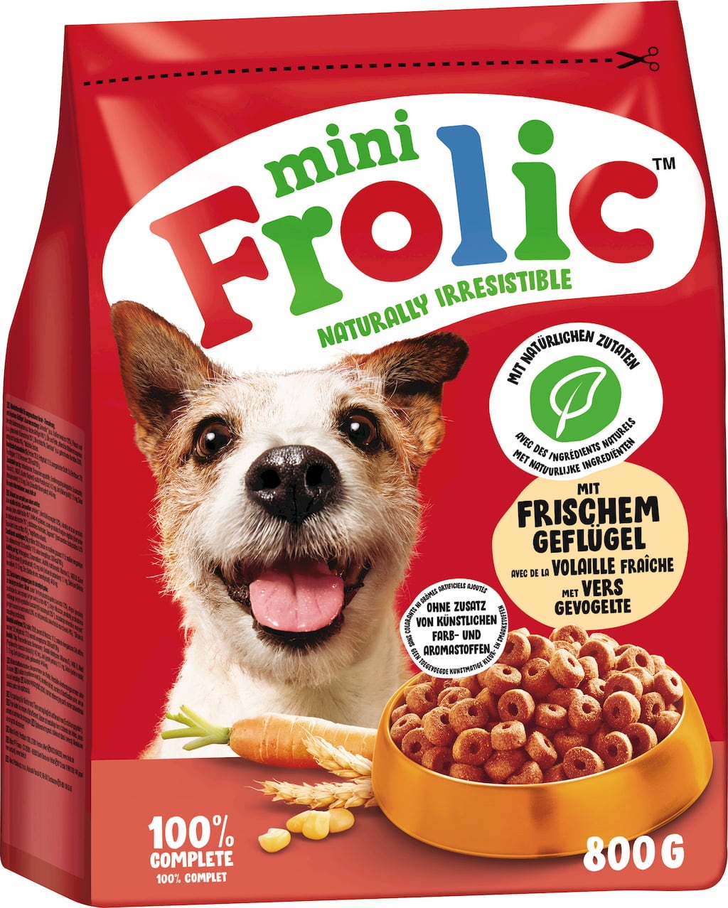 Dogs love Frolic! The delicious Mini Frolic is a balanced pet food that contains everything your dog needs! The food is tailored to the needs of adult, smaller dog breeds, providing them with essential vitamins and minerals from carefully selected ingredients such as protein-rich poultry meat, tasty vegetables, and delicious wholegrain wheat. This ensures your dog stays full of energy throughout the day.