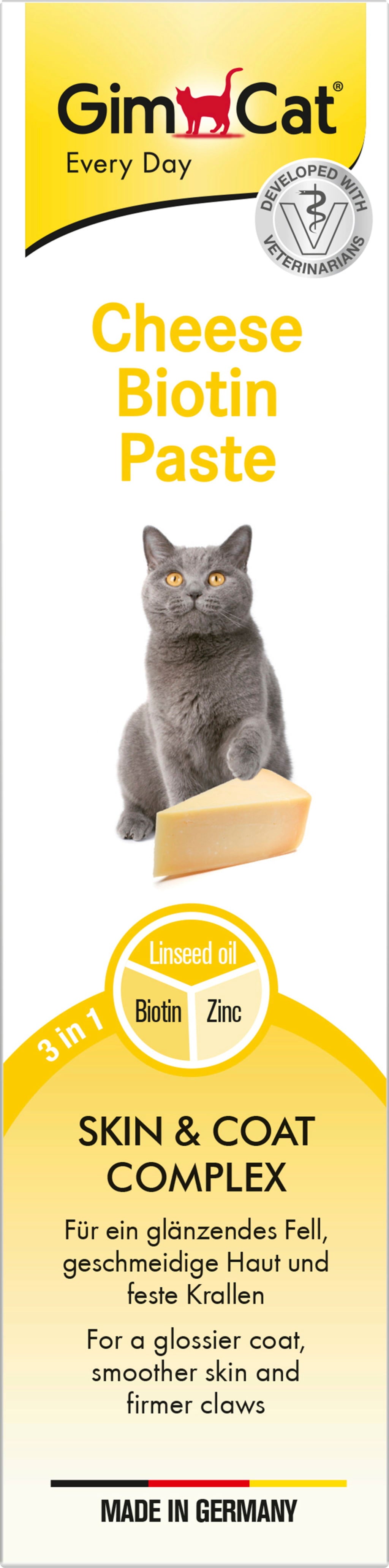 A delicious treat in paste form: The nutrient-rich Cheese Biotin Paste by GimCat pampers little gourmets from 6 weeks of age with irresistible Italian hard cheese. No gourmet kitten can say no to that! With a natural 3-in-1 active ingredient complex of biotin, zinc, and linseed oil.