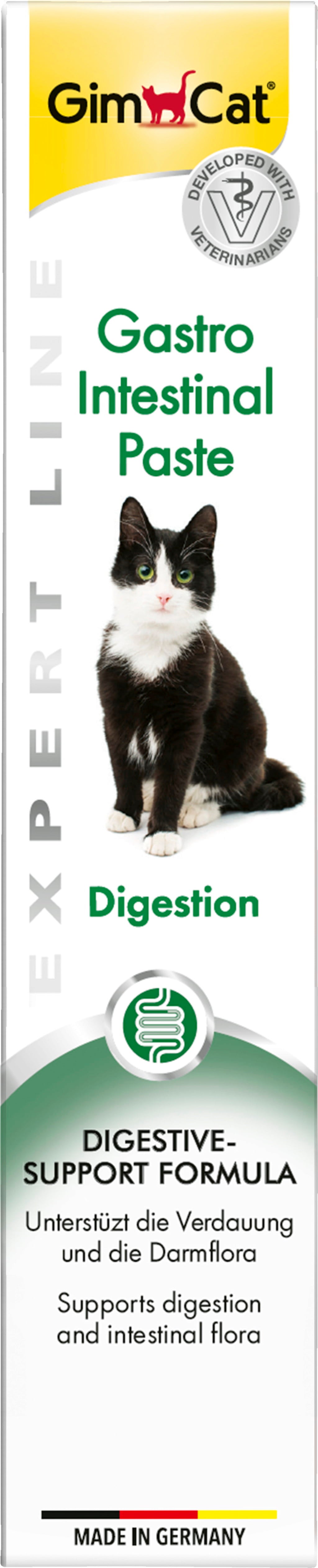 The Gastro Intestinal Paste by GimCat contains many valuable ingredients that can provide optimal support for your cat. For example, the paste includes fibres from psyllium husks, elm bark, beta-glucan, and dried grass. The paste has been co-developed with veterinarians and contains neither added sugar nor artificial flavours.