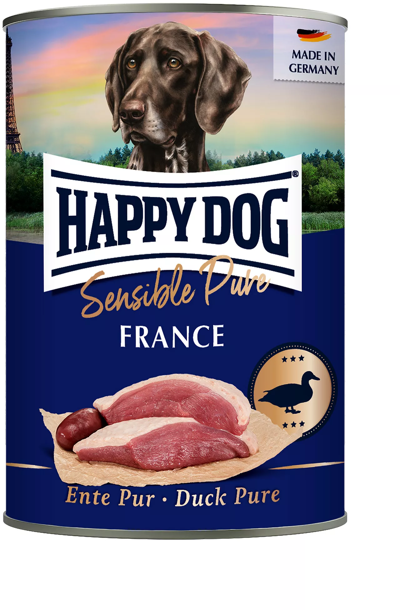 Happy Dog Sensible Pure France is an incredibly tasty wet food for nutritionally sensitive pets with food intolerances. The soya and gluten-free recipe made from tender duck meat and offal ensures particularly varied moments of pleasure. Valuable vitamins and minerals support harmonious well-being! 100% animal protein from duck, without vegetable additives, flavourings or colourings.