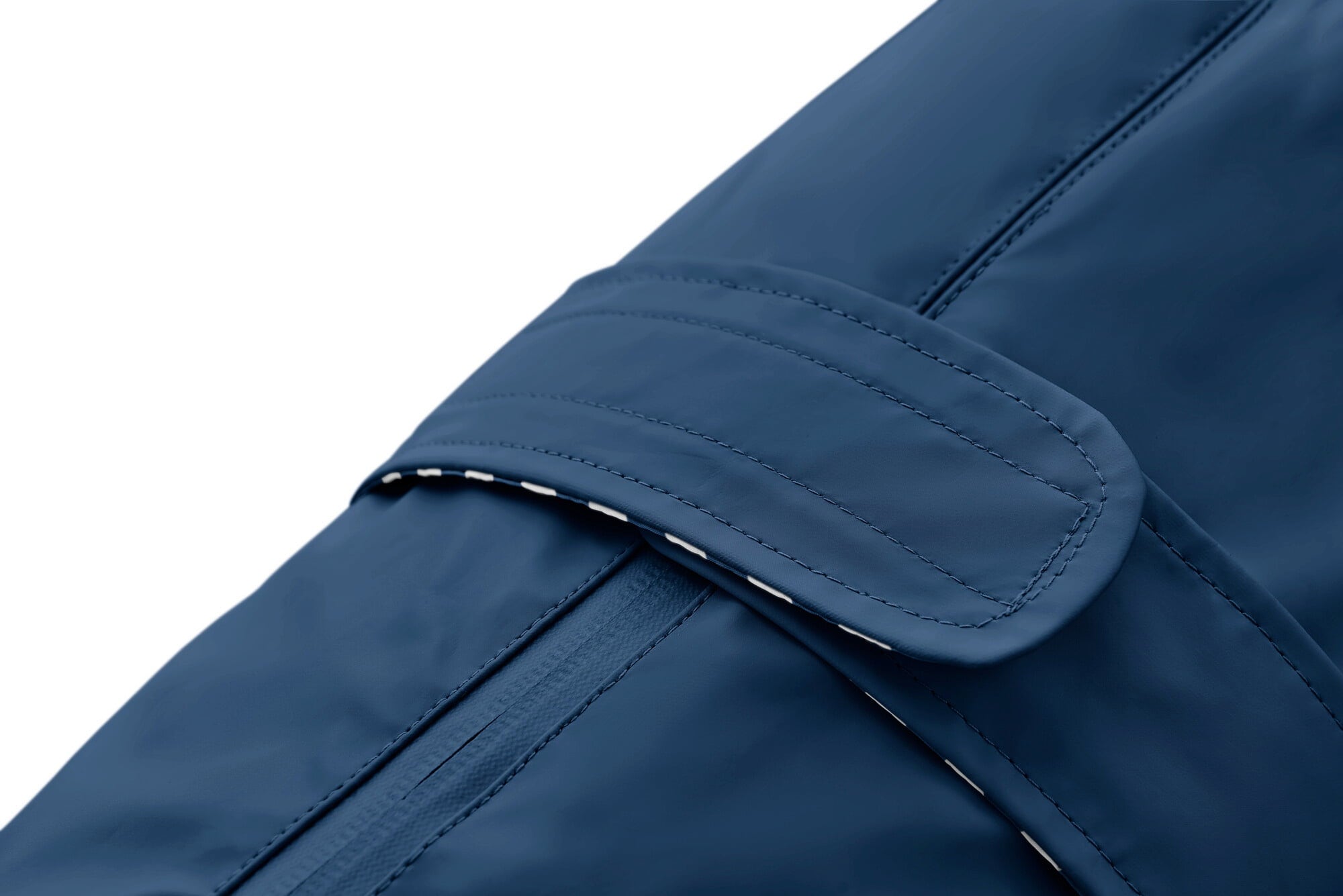 Stylish, classic, Milford! This mackintosh for dogs is in no way inferior to its owner's raincoat - it is as functional as it is stylish and tailored to the special needs of its wearer: Elasticated straps at the hind legs allow for a perfect fit, the material is lightweight but still provides optimum protection in stormy, muddy weather.