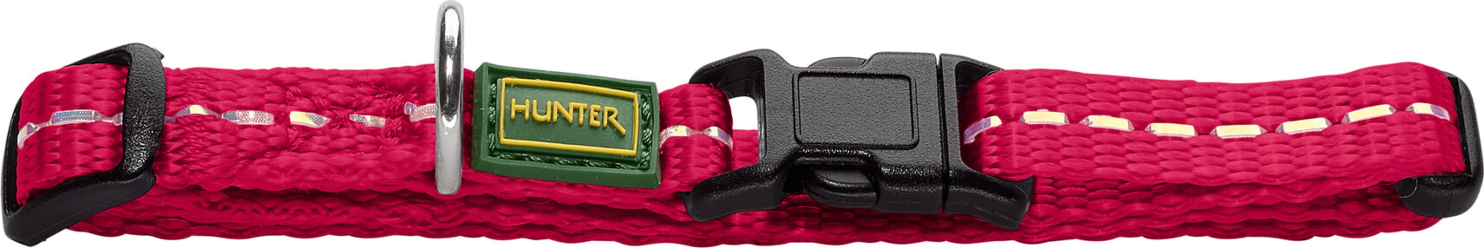 This collar by Hunter is designed for small dogs and puppies. It features bright colours with reflective stripes for visibility. Made from strong nylon and equipped with an adjustable system, it is perfect for daily use.