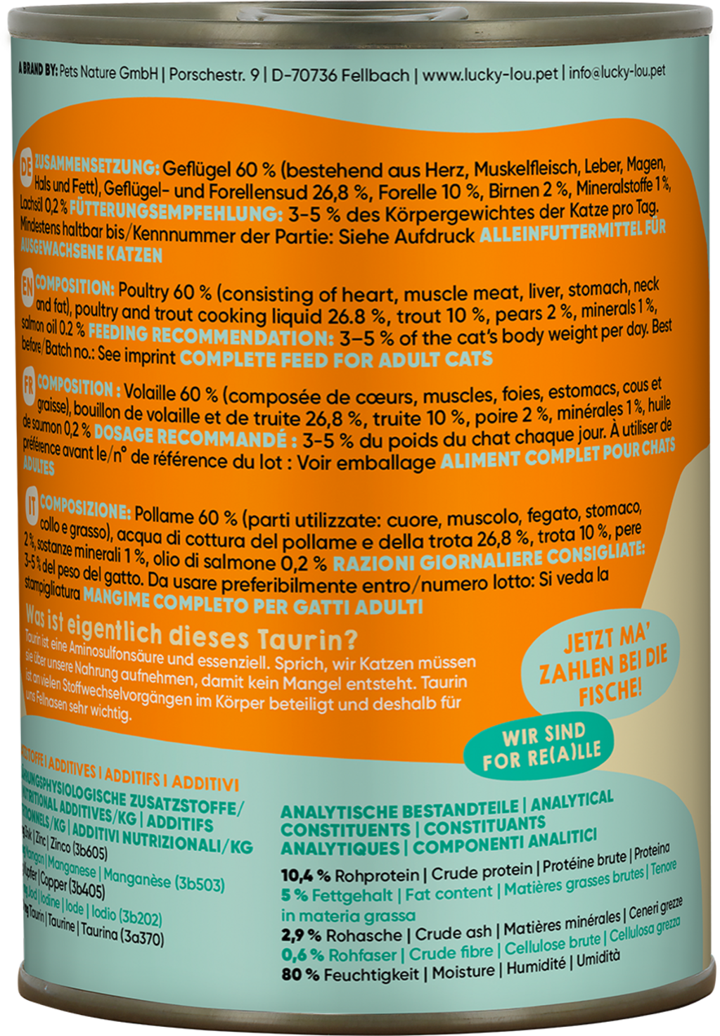 60 % Poultry (Heart, Muscle meat, Liver, Stomach, Neck, Fat), 26,8 % Poultry and trout broth, 10 % Trout, 2 % Pear, 1 % Minerals, 0,2 % Salmon oil