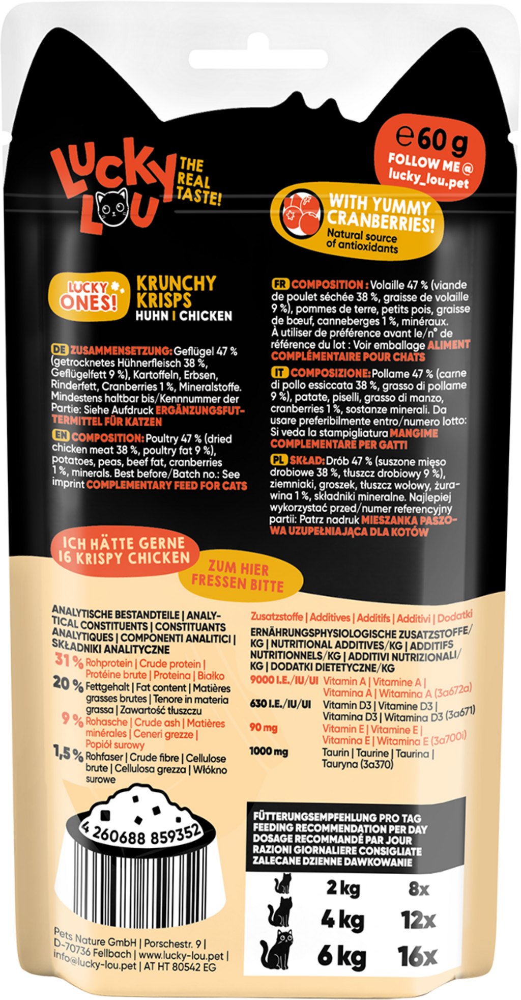 Irresistibly crunchy on the outside and delightfully soft on the inside, Krunchy Krisps transport your cat to the seventh snacking heaven. There, they're met not only with heavenly taste but also a cat-friendly recipe with selected ingredients like valuable oils and superfoods. Your cat can indulge more often.