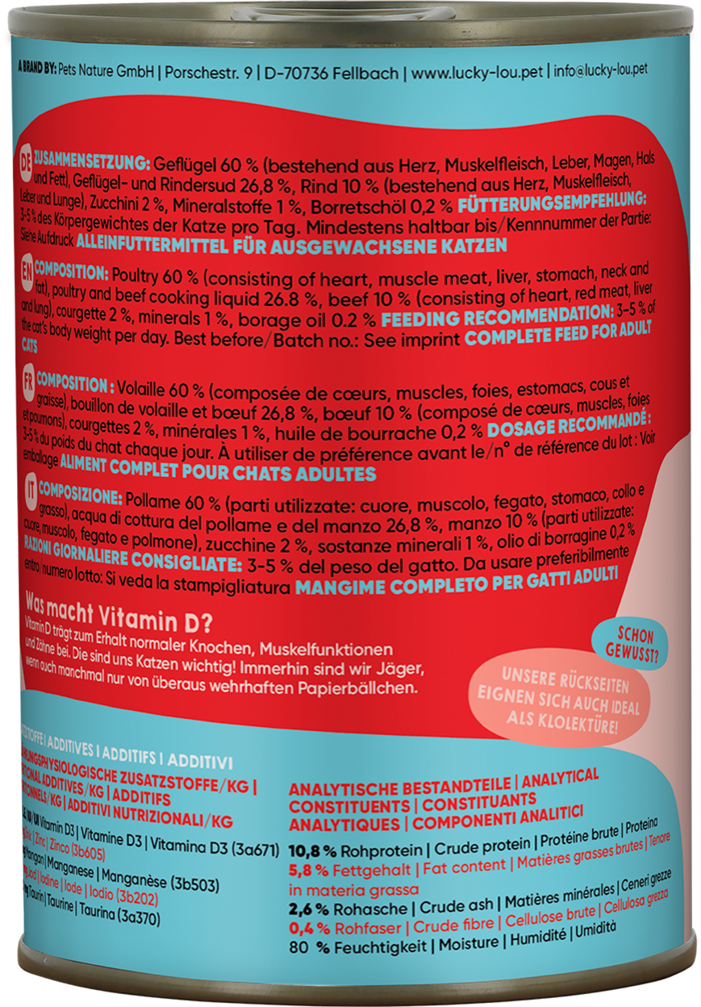 Attention cool cats! This wet pet food provides your cat with everything it needs daily, just like nature intended. It's not only a high-quality nutritional foundation for a vibrant cat life but also tastes amazingly delicious. Your cat would choose it over any mouse.
