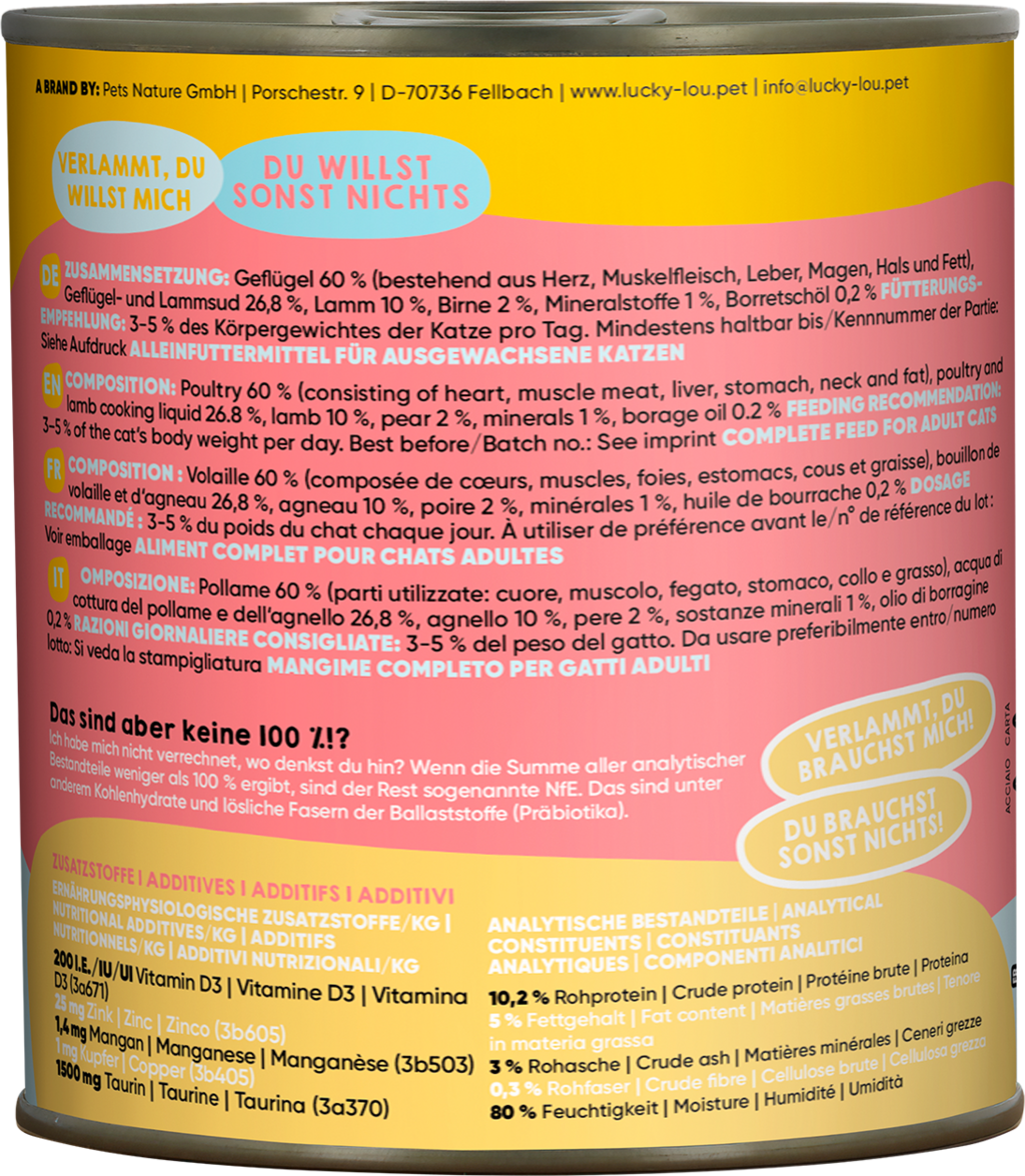 60 % Poultry (Heart, Muscle meat, Liver, Stomach, Neck, Fat), 26,8 % Poultry and lamb broth, 10 % Lamb, 2 % Pear, 1 % Minerals, 0,2 % Borage oil