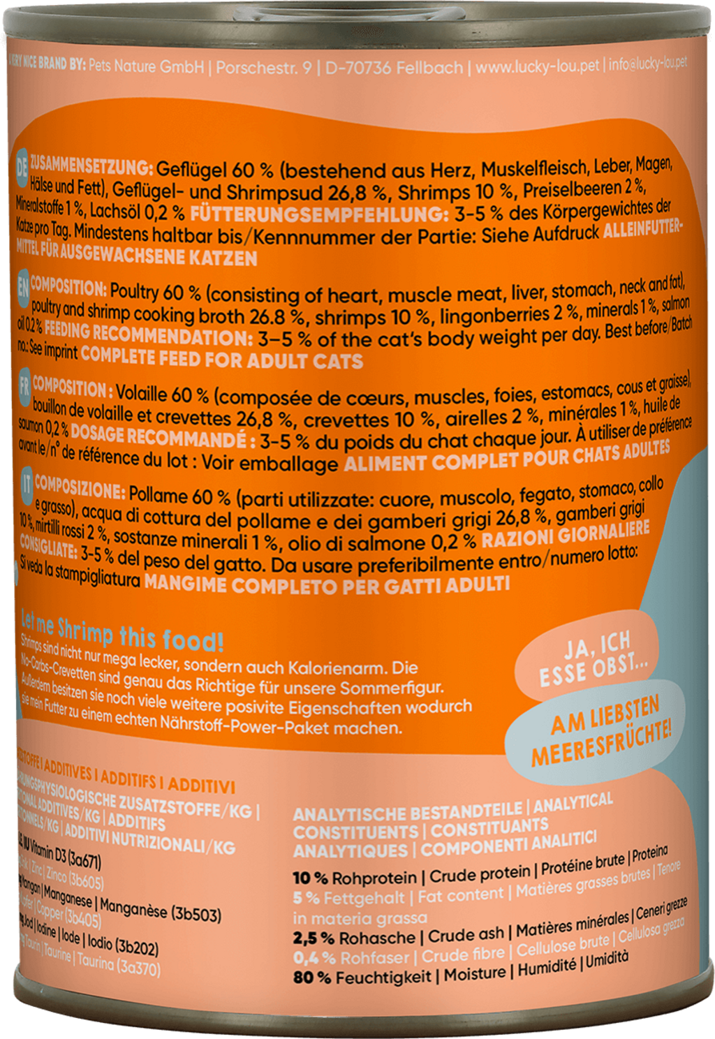 60 % Poultry (Heart, Muscle meat, Liver, Stomach, Neck, Fat), 26,8 % Poultry and shrimp broth, 10 % Shrimps, 2 % Cranberries, 1 % Minerals, 0,2 % Salmon oil