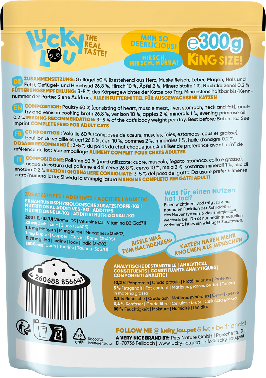 60 % Poultry (Heart, Muscle meat, Liver, Stomach, Neck, Fat), 26,8 % Poultry and venison broth, 10 % Deer, 2 % Apples, 1 % Minerals, 0,2 % Evening primrose oil