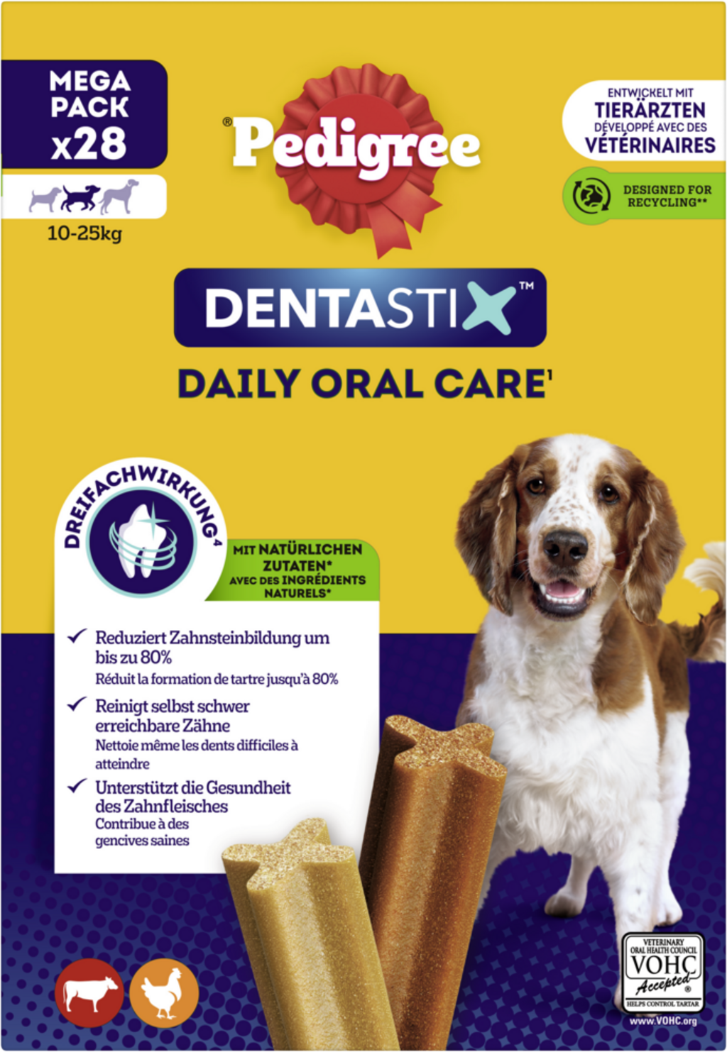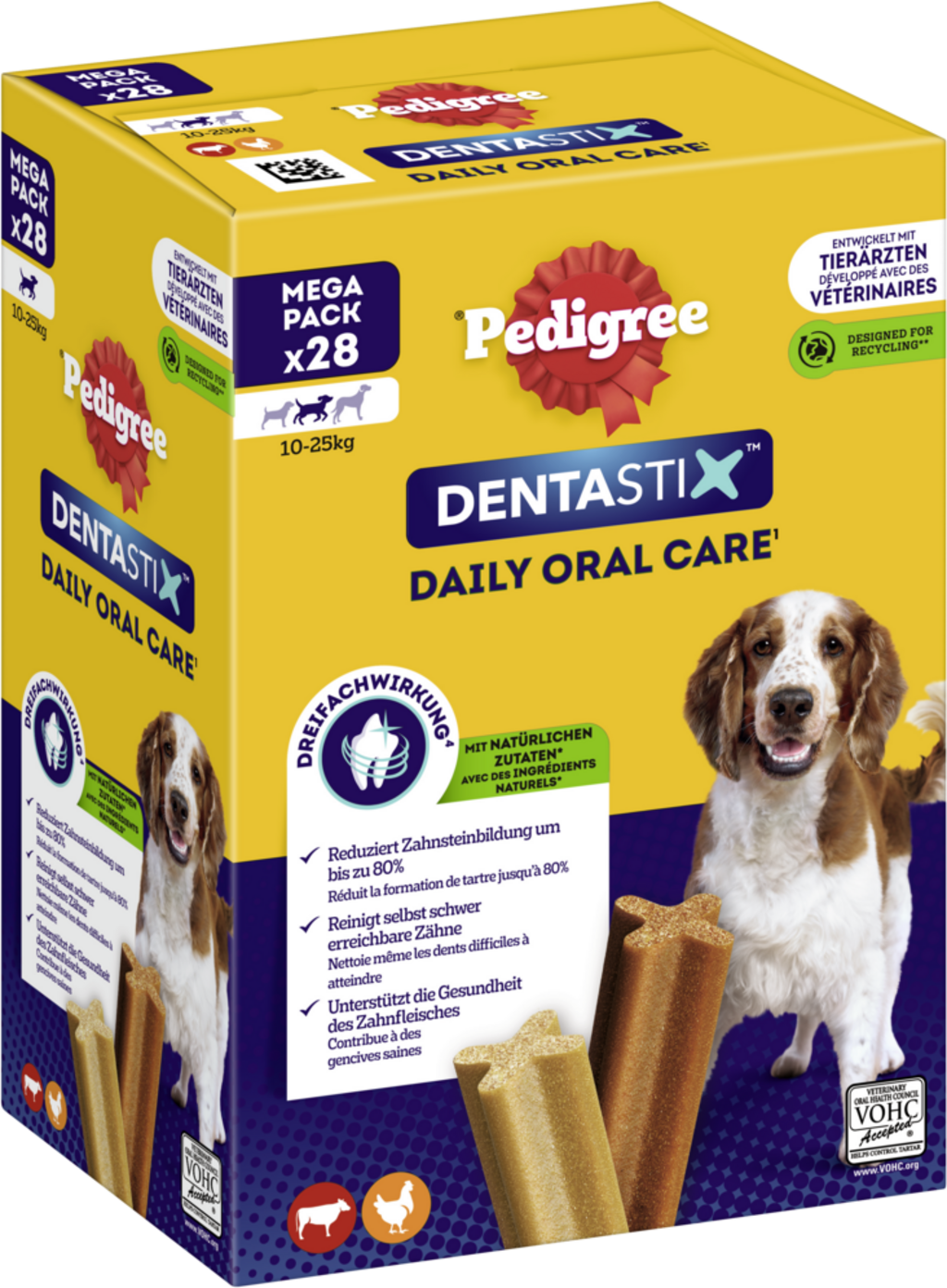 Tartar build-up on teeth is a health hazard for dogs. With special snacks such Pedigree® Dentastix™ you can address two issues with one delicious doggie treat! The special consistency acts like dental care when your dog chews on a Dentastix - this can reduce tartar formation by up to 80% if given daily. Furthermore, this supplementary feed is packed with meaty flavour and is fortified with valuable vitamins, minerals and oils. Dentastix Medium is suitable for dogs weighing 10 to 25 kg. Each pack contains 28 pieces.
