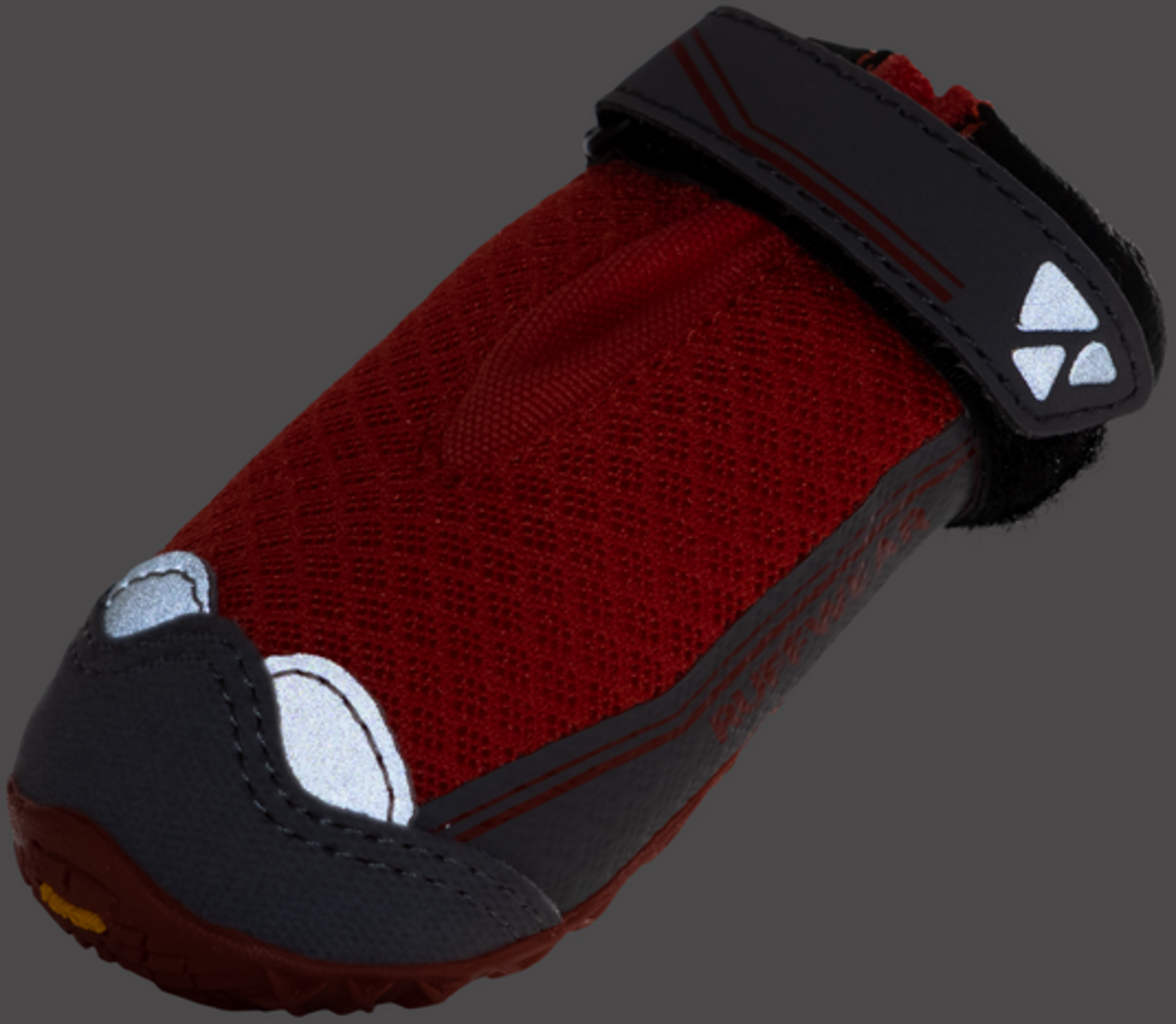 The boots feature a durable Vibram sole with specially designed lug traction, providing superior grip on nearly any surface—even over extended distances. The upper is crafted from breathable, tightly woven mesh fabric to keep your dog's paws cool and comfortable. Velcro fasteners with adjustable fittings secure the narrowest part of the leg, ensuring a snug, reliable fit. Plus, integrated reflectors enhance visibility in low-light conditions, such as during twilight or rainy weather.