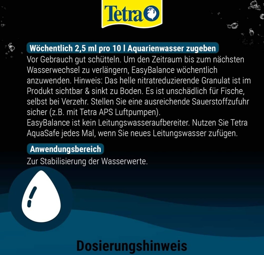 Shake well before use. Add 2.5 ml Tetra EasyBalance per 10 l aquarium water weekly. Use the dosing cap for measuring. 1 line on the measuring scale = 10ml. The bright nitrate-reducing granulate is visible in the product and sinks to the bottom. It is harmless to fish, even when eaten. It is important to use Tetra EasyBalance weekly to extend the period until the next water change.
