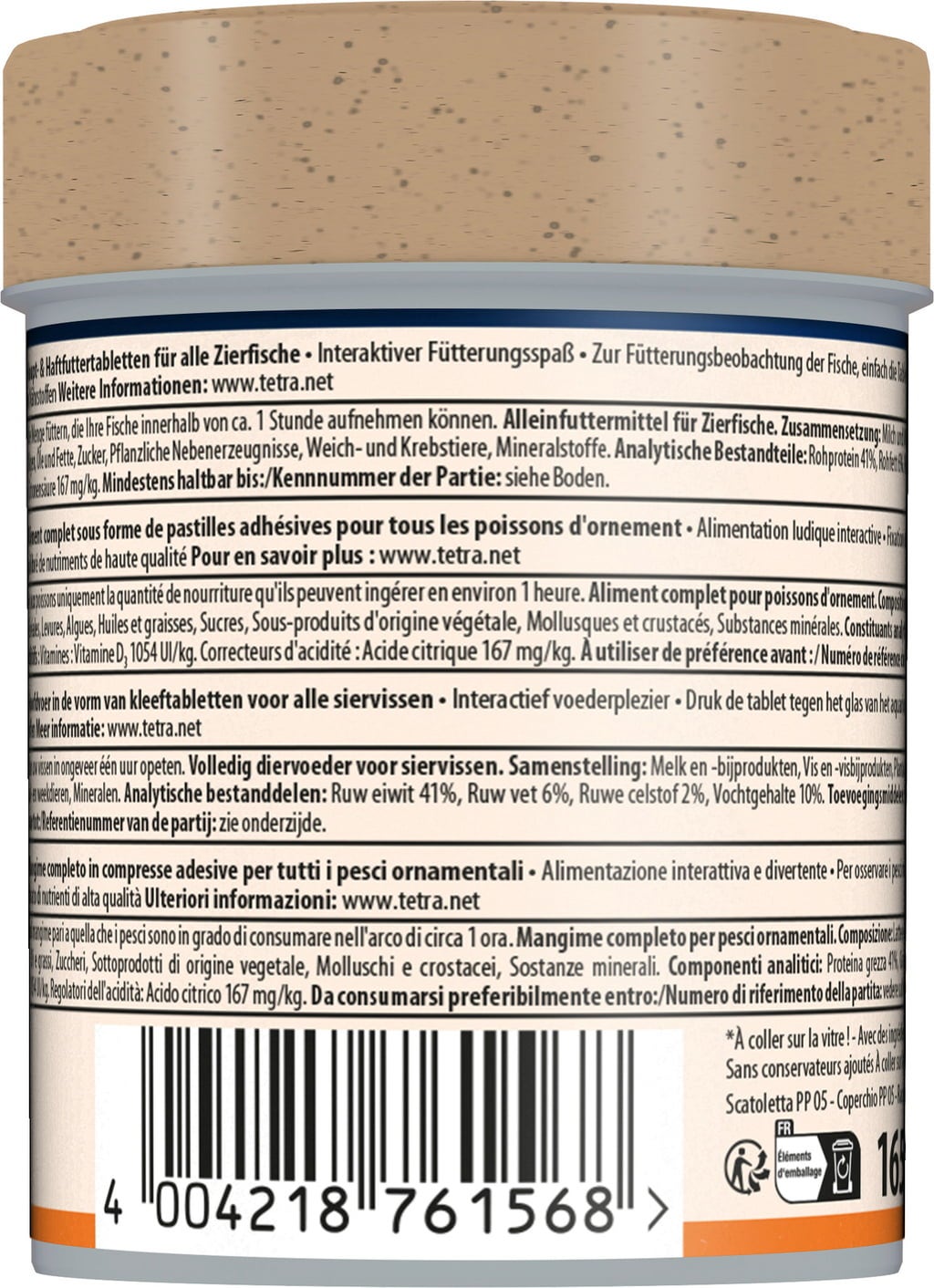 TetraFunTips tablets are food tablets for feeding your fish right in front of your eyes. The 2 in 1 food tablet mixture consists of high-quality flakes and nutritious natural food. The tablets contain over 20% natural ingredients (BrineShrimps, Krill, Gammarus and Daphnien). The orange side contains carotenoids for natural colour enhancement, the green side consists of herbal ingredients such as spirulina and chlorella algae to promote vitality and health. The food tablets can be attached to the pane of the aquarium from both sides to attract the fish and watch them eat. They can also be easily attached to decorative elements. A small hole in the middle ensures easy fixation. The improved recipe contains high-quality special flakes and high amounts of natural feed.