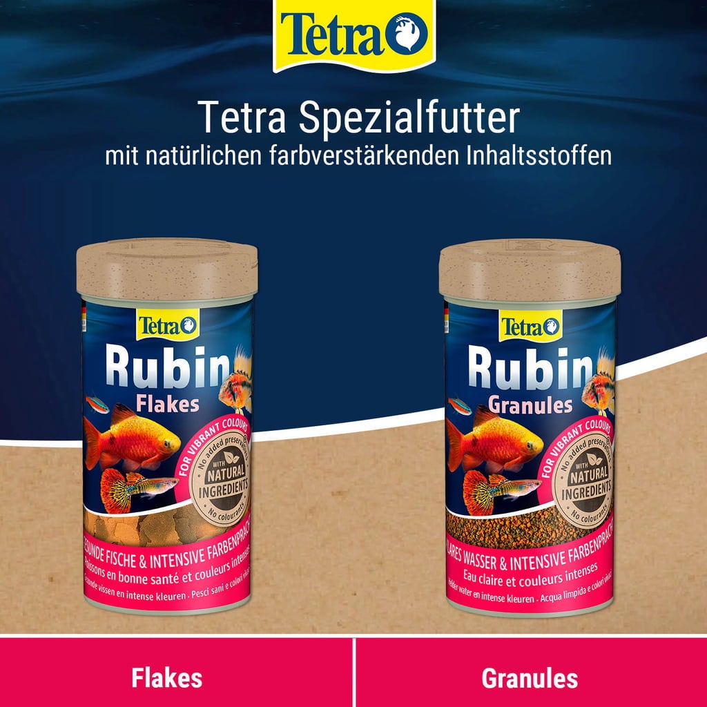 Tetra Rubin Flakes ensures vibrant colours in your aquarium fish. It contains natural colour enhancers without hormones that ensure more intense colours in yellow, orange and red fish which is already visible two weeks after you start feeding this product.