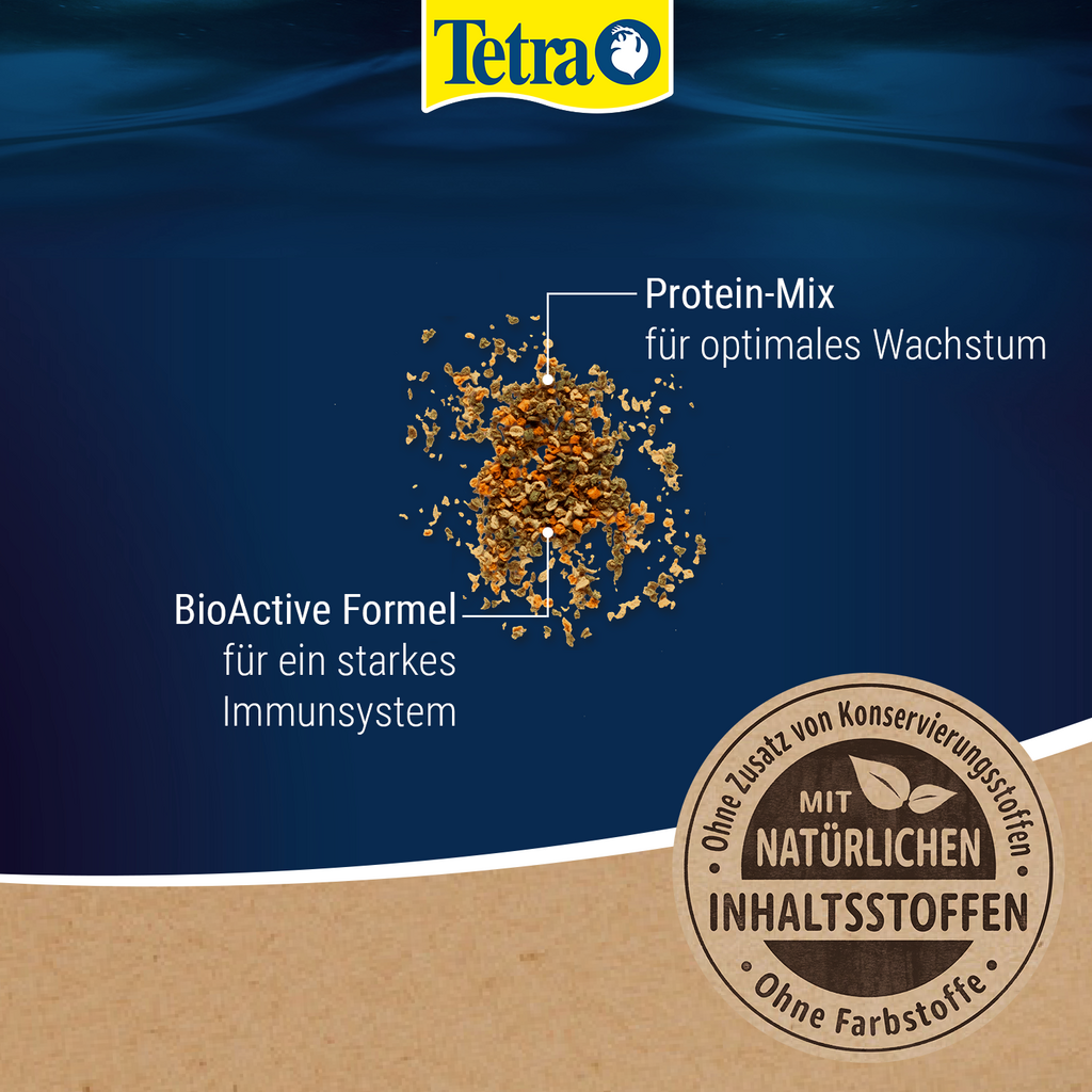 The high-quality formulation with natural ingredients as well as BioActive formula and extra prebiotics comes without colourants and added preservatives and supports a vital fish life and a normally functioning immune system. The high digestibility also ensures that the water in the aquarium stays clean for a long time.