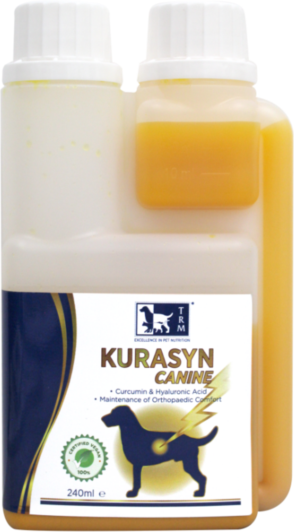 Kurasyn Canine by TRM contains curcumin in a complex with a naturally occurring oligosaccharide and hyaluronic acid, which provides optimum support for dogs' joints and bones. The liquid supplement is suitable for dogs of all sizes and is also very suitable for older dogs. It is easy to feed - simply mix into your dog's food.