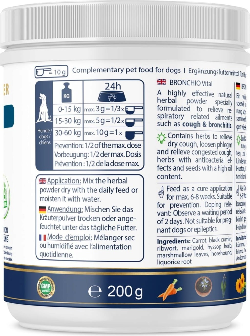 A dry or mucous cough can be extremely uncomfortable for your dog. The Bronchio Vital herbal powder can relieve symptoms related to the respiratory tract. It contains herbs proven to have antibacterial properties and seeds with high oil content. Combined with vegetables rich in vitamins and minerals.