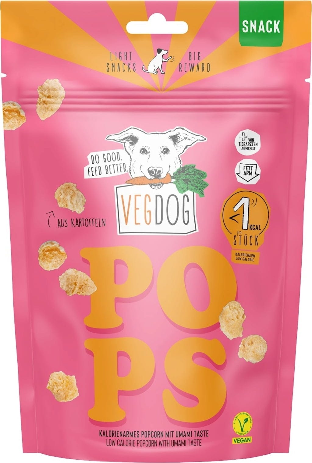 Do you want to reward your pet during training while also monitoring their diet? VEGDOG has created Pops, dog treats that are perfect as low-calorie training snacks. These small, puffed treats contain only 3 ingredients and have less than 1 kcal per piece. The main flavour is potato, which many dogs love. Enjoy natural snacking made easy.