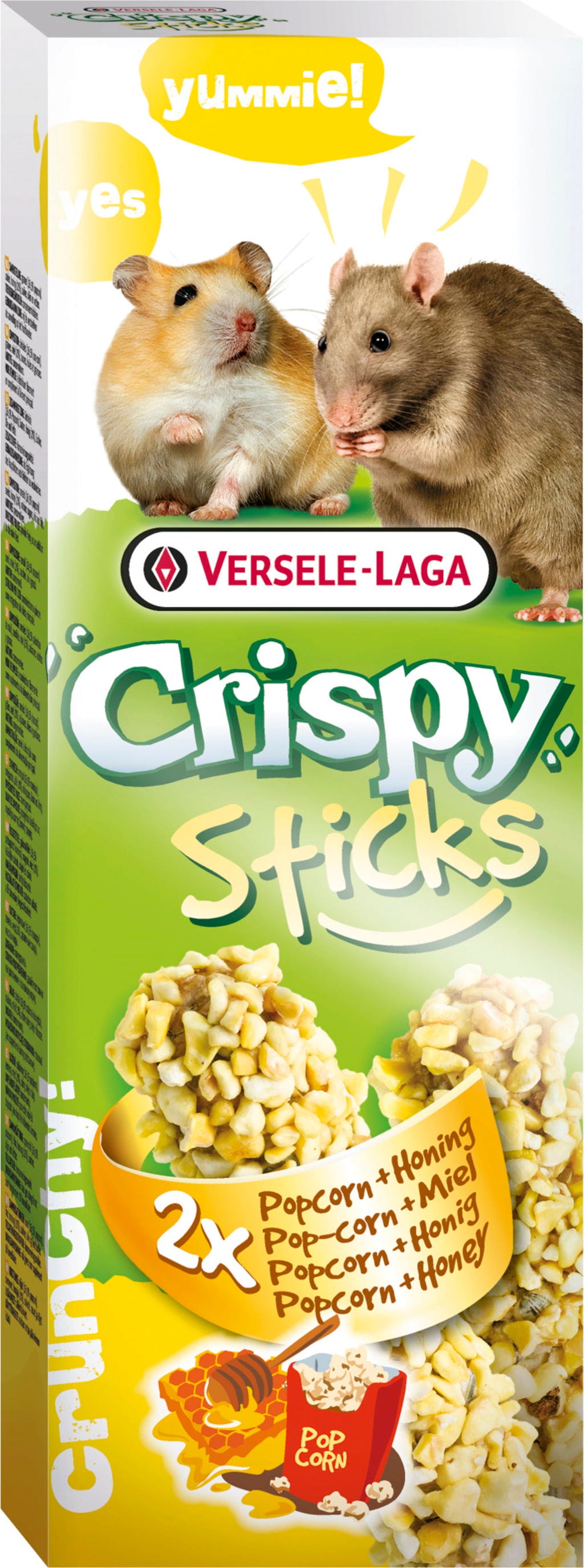 These oven-baked Crispy Sticks are an itrresistible treat for hamsters and rats! It is built around a natural wooden core and features a handy clip with which it can be easily attached to their cage. These crunchy sticks feature a delightful flavour combination of popcorn and honey.