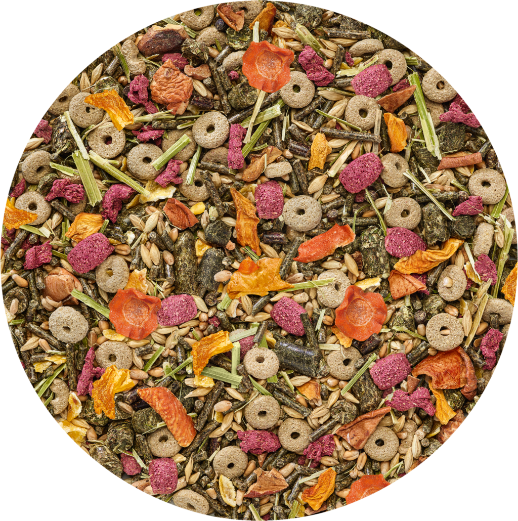 Vegetable by-products (10,6 % Lucerne), 41,6 % Cereals, Vegetables (1 % Dried pumpkin), Fruits (1 % Dried apples), Minerals, Oils and fats, Yucca schidigera
