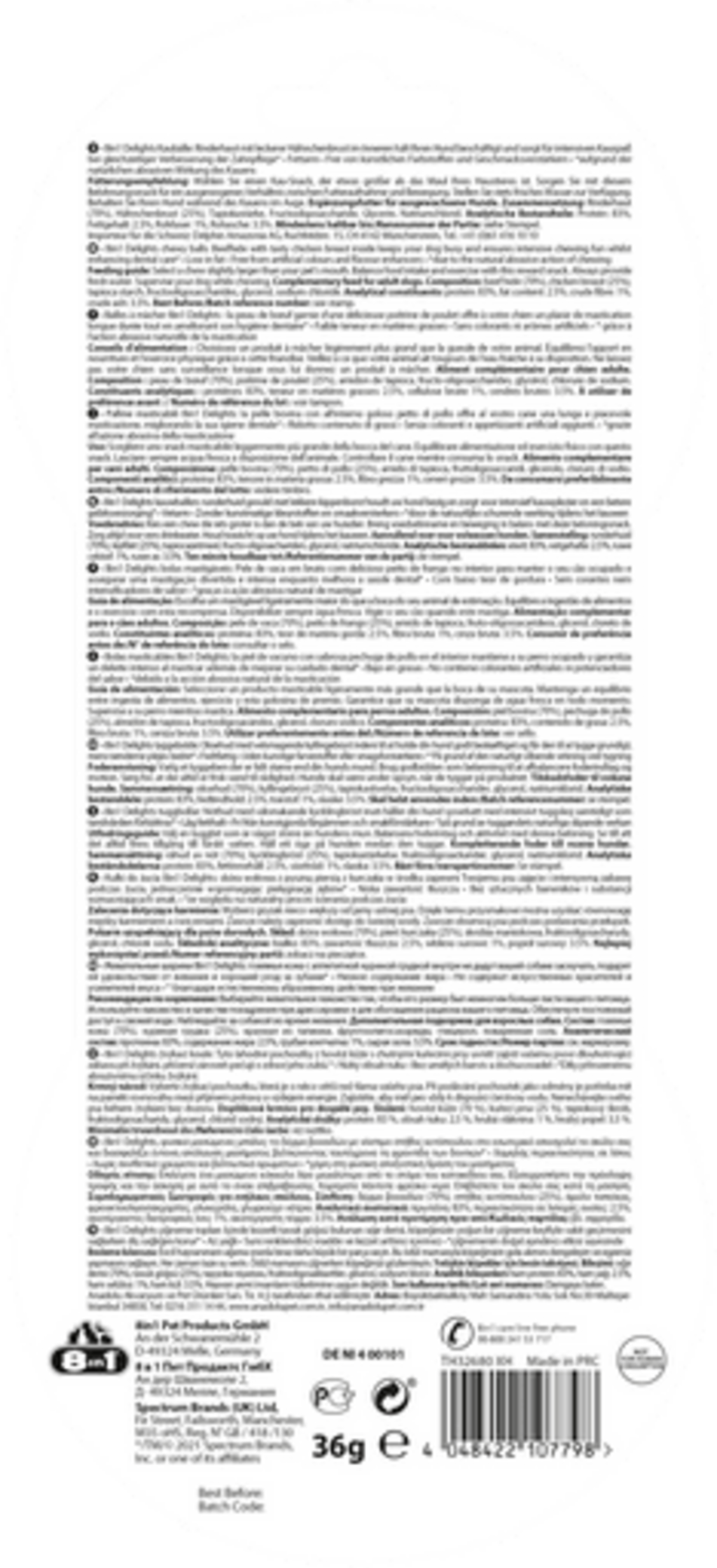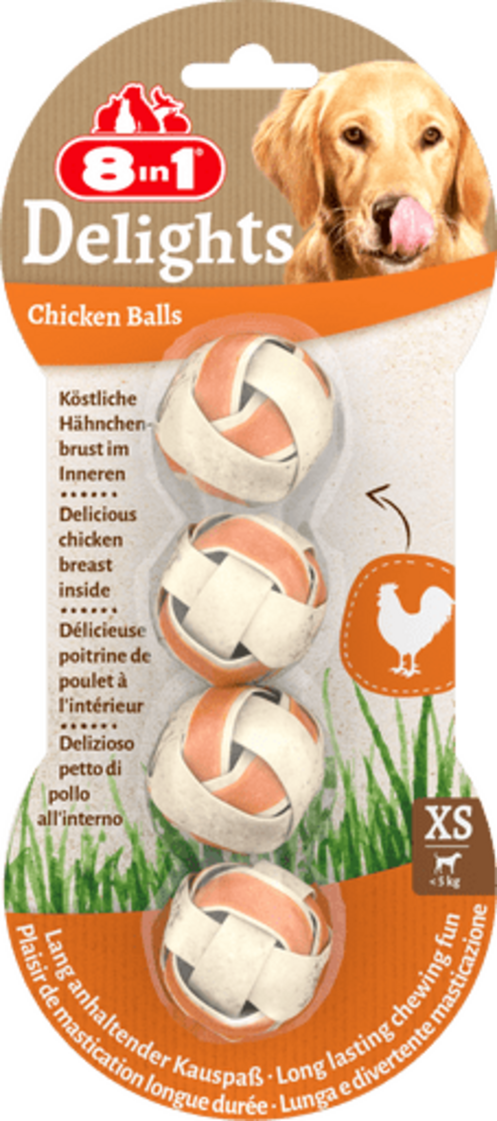 De savoureux blancs de poulet enrobés d'une délicieuse peau de bœuf... Miam ! Les chiens gourmands en ont déjà l'eau à la bouche ! Les Chicken Balls Delights de 8in1 sont excellentes à mâcher entre les repas, pour un bon complément à la nourriture classique ! Elles occuperont votre chien pendant des heures, et sont également bénéfiques pour son hygiène dentaire ! La mastication élimine tartre existant.