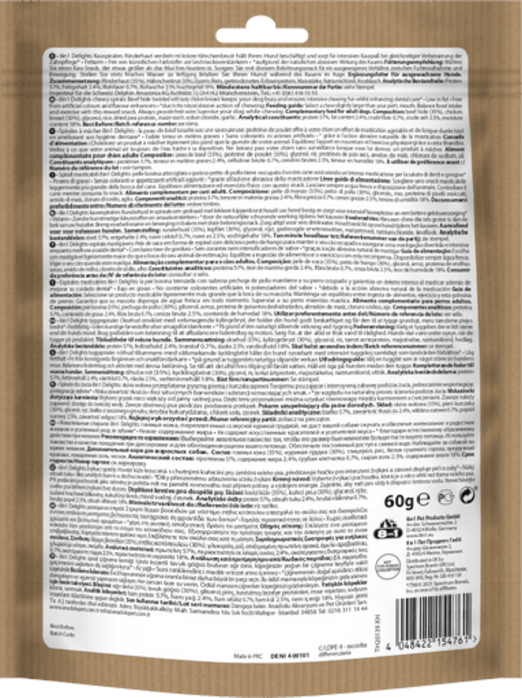 Les Delights Chichen Spirals de 8in1 sont de délicieuses friandises pour votre adorable boule de poils ! Les friandises à mâcher en forme de spirales contiennent de la délicieuse peau et de la viande de bœuf savoureuse, sont pauvres en matière grasses et riches en protéines ! Mais elles ne sont pas seulement délicieuses : le frottement mécanique sur les dents contribuent efficacement et durablement à une bonne hygiène bucco-dentaire ! Pour un plaisir de mastication longue durée !