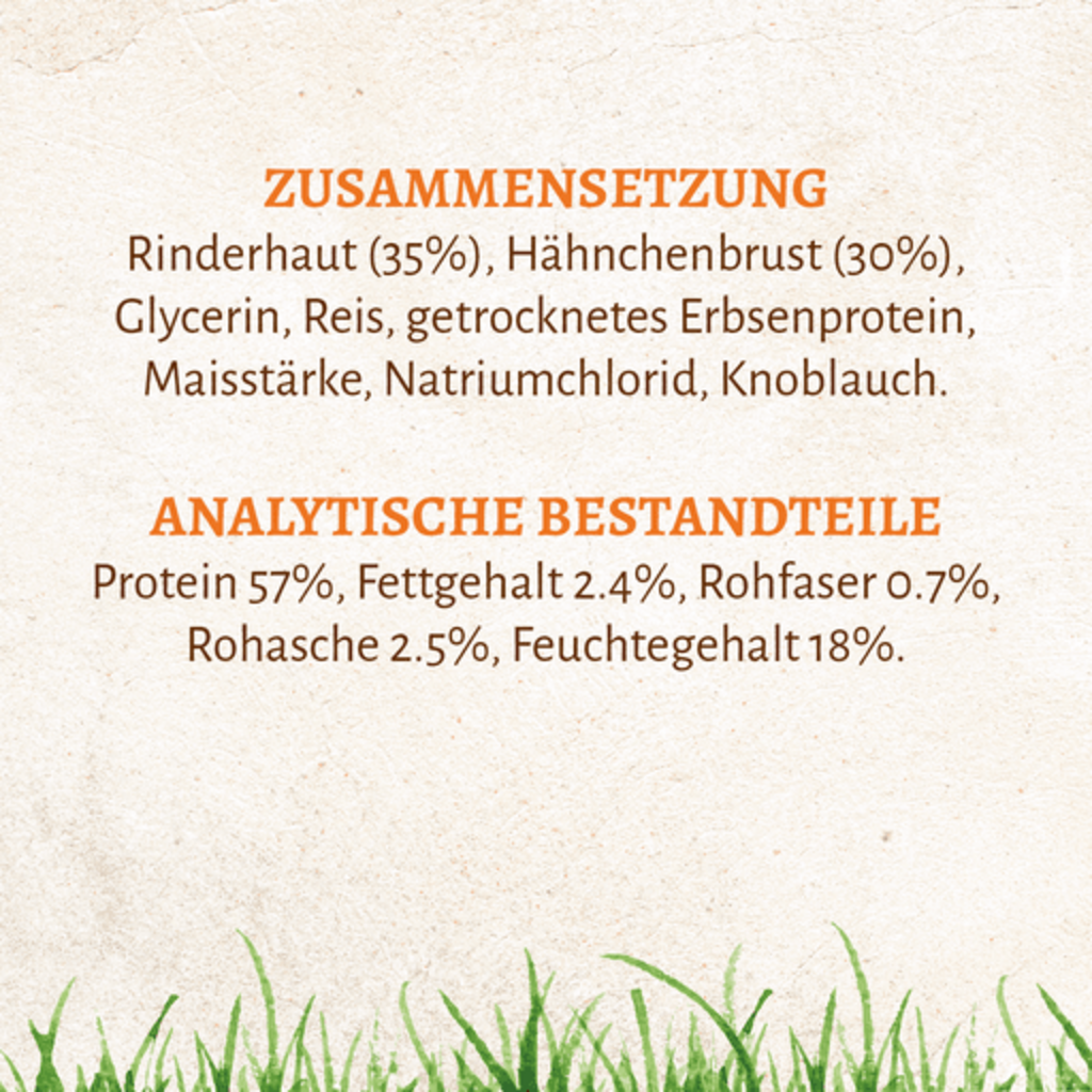 35 % Peau de bœuf, 30 % Blanc de poulet, glycérine, Riz, Protéines de pois séchées, amidon de maïs, Chlorure de sodium, Ail
