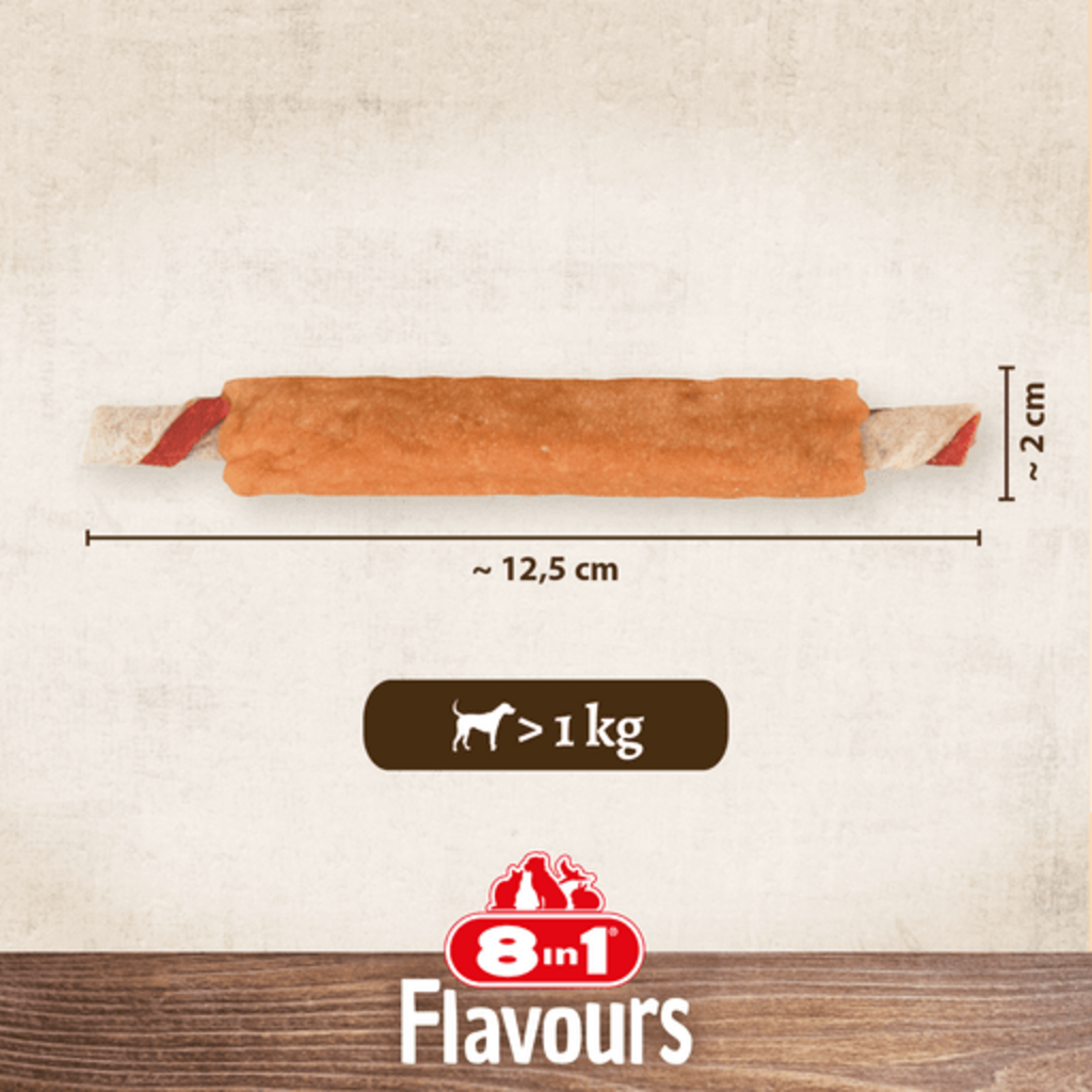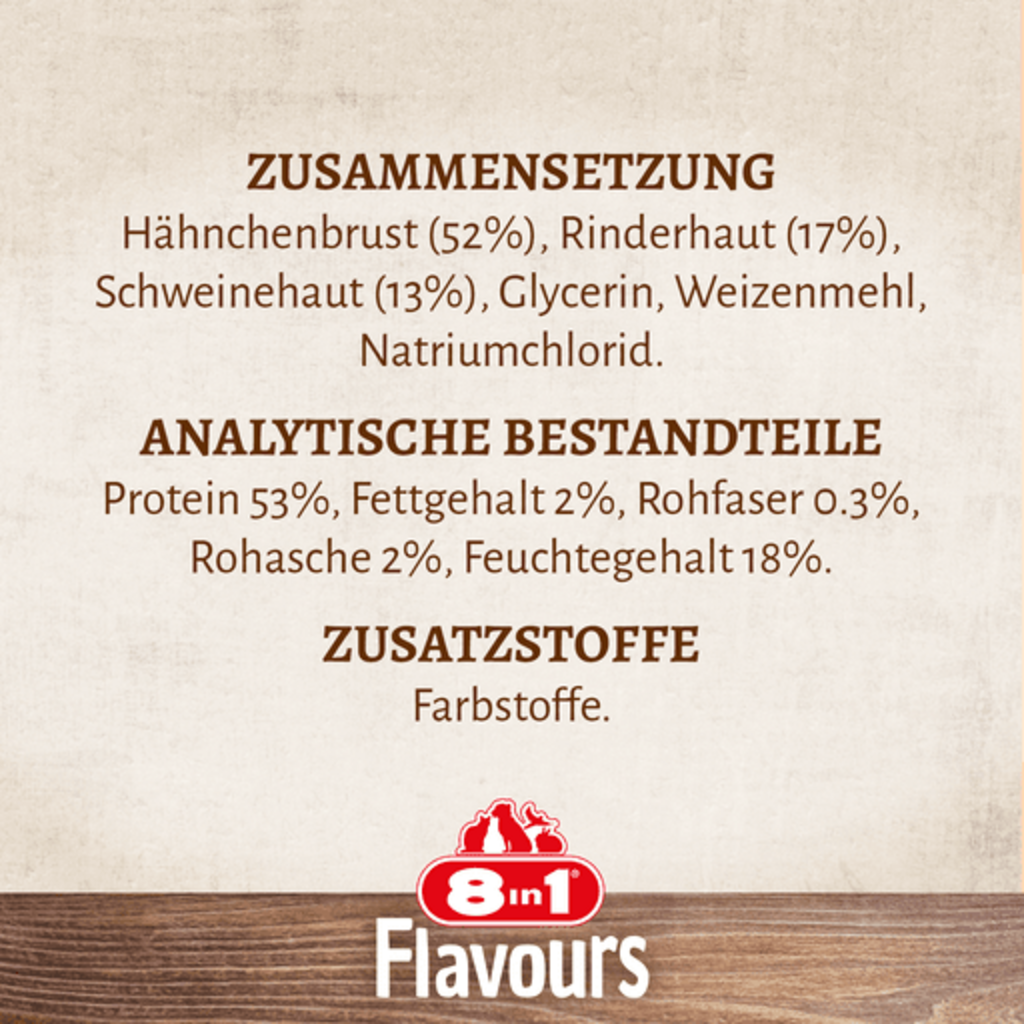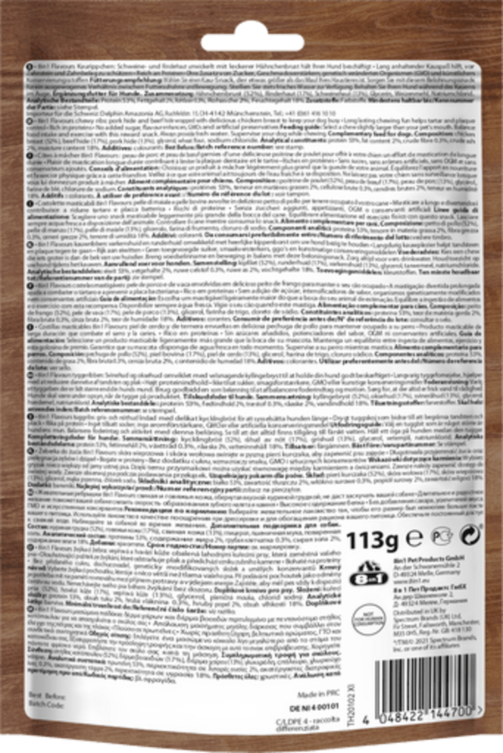 Les Triple Flavour Ribs de 8in1 sont de véritables créations culinaires ! Ces ribs à mâcher sont une délicieuse composition à base de peau de porc et de bœuf, enrobée d'une poitrine de poulet tendre et juteuse. Ils sont également une aide à la bonne santé dentaire de votre chien : grâce à l'effet abrasif de la mastication, elles luttent durablement contre le tartre et la plaque dentaire. Les gencives sont également massées efficacement, ce qui contribue à maintenir la dentition en bonne santé.