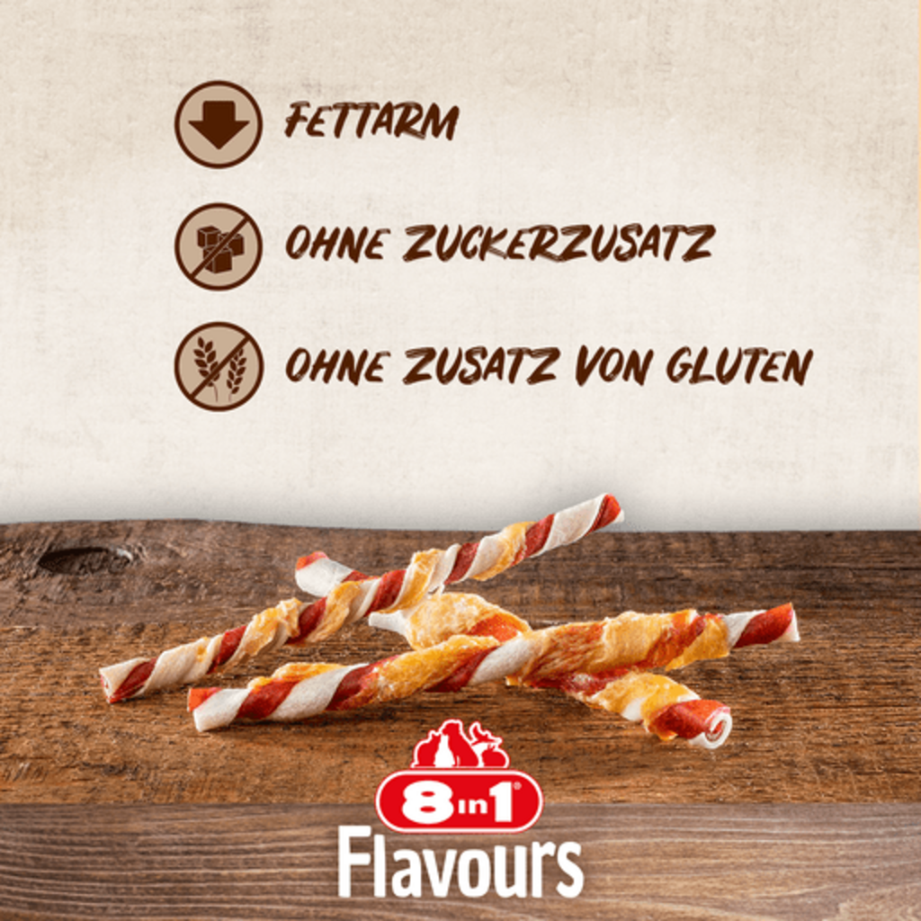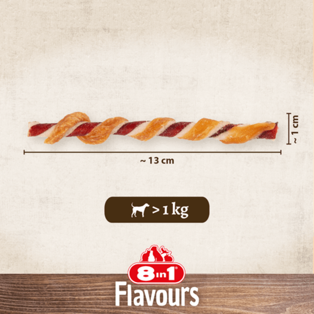 Les Triple Flavour Twists de 8in1 sont le choix idéal si vous êtes à la recherche de friandises savoureuses pour votre chien. Le mélange de peau de porc et de bœuf, enrobée de poitrine de poulet tendre et juteuse, crée une véritable explosion de saveurs ! Votre animal de compagnie adorera !