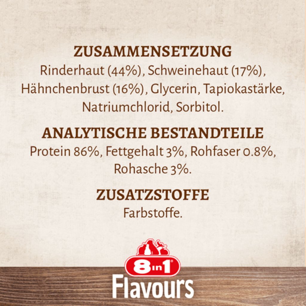 44 % Peau de bœuf, 17 % Peau de porc, 16 % Blanc de poulet, glycérine, Tapioca, Chlorure de sodium, Sorbitol