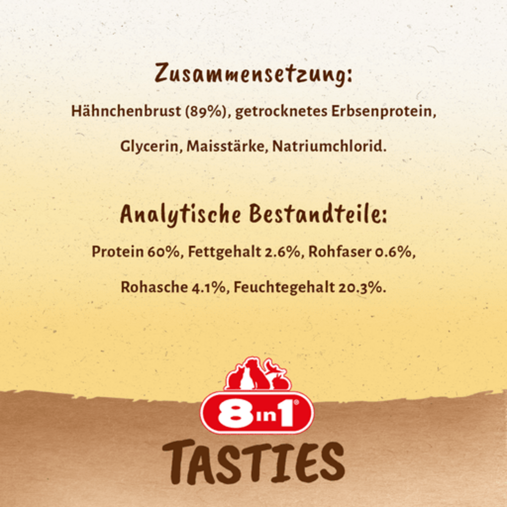 Délicieux, irrésistibles... les Tasties Chicken Chips de 8in1 ! Ces récompenses bénies contiennent un savoureux blanc de poulet très riche en protéines ! Cette friandise riche en protéines est facile à digérer, ne contient pas de sucres ajoutés et est pauvre en matières grasses. Cuite au four, elle ne contient pas de gluten, d'exhausteurs de goût, d'organismes génétiquement modifiés, de conservateurs artificiels ni de colorants. Tout simplement délicieux !