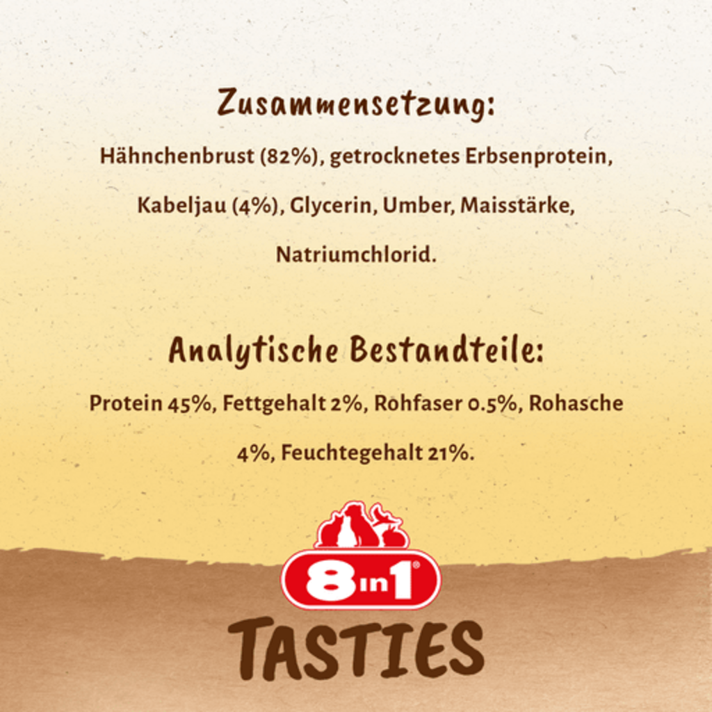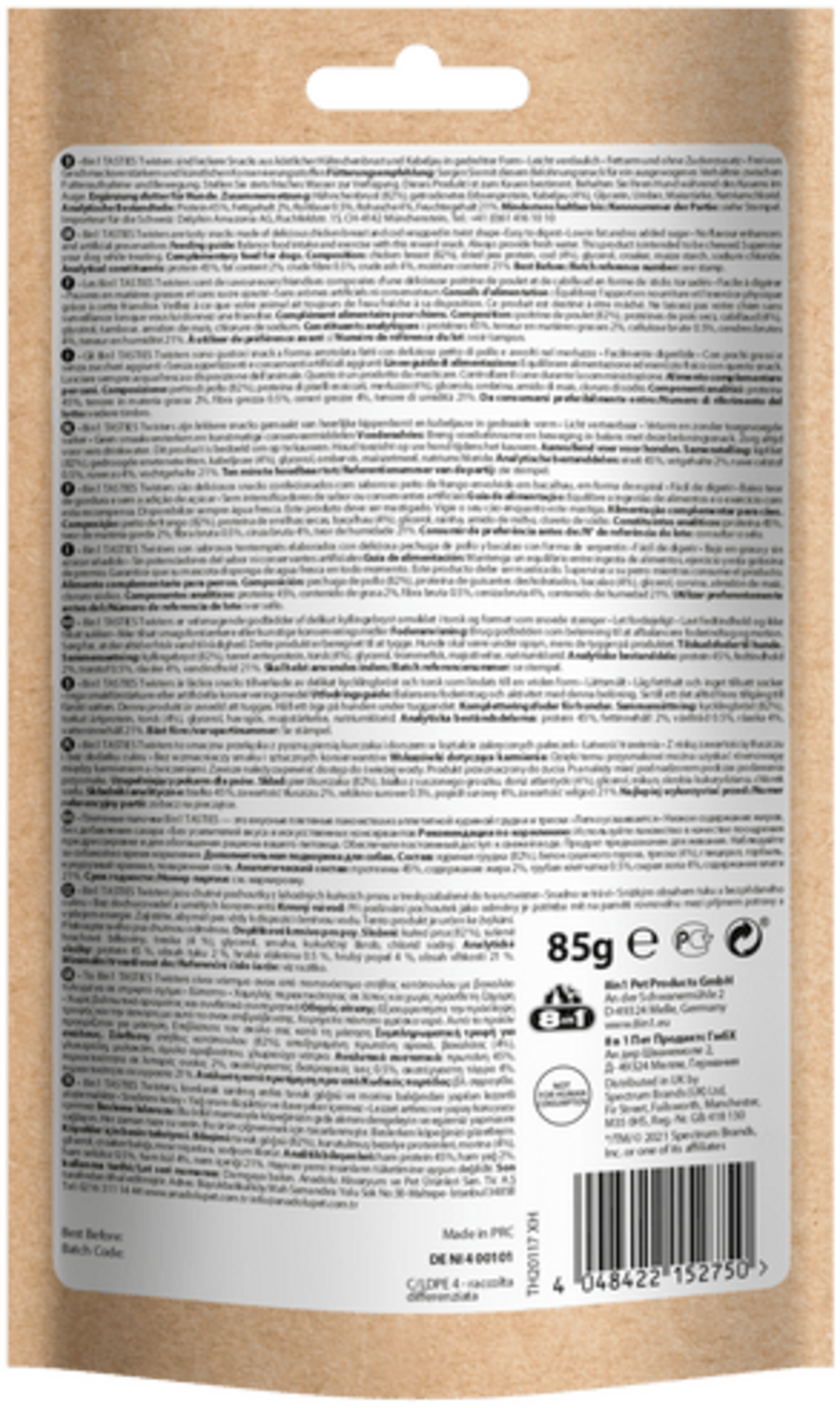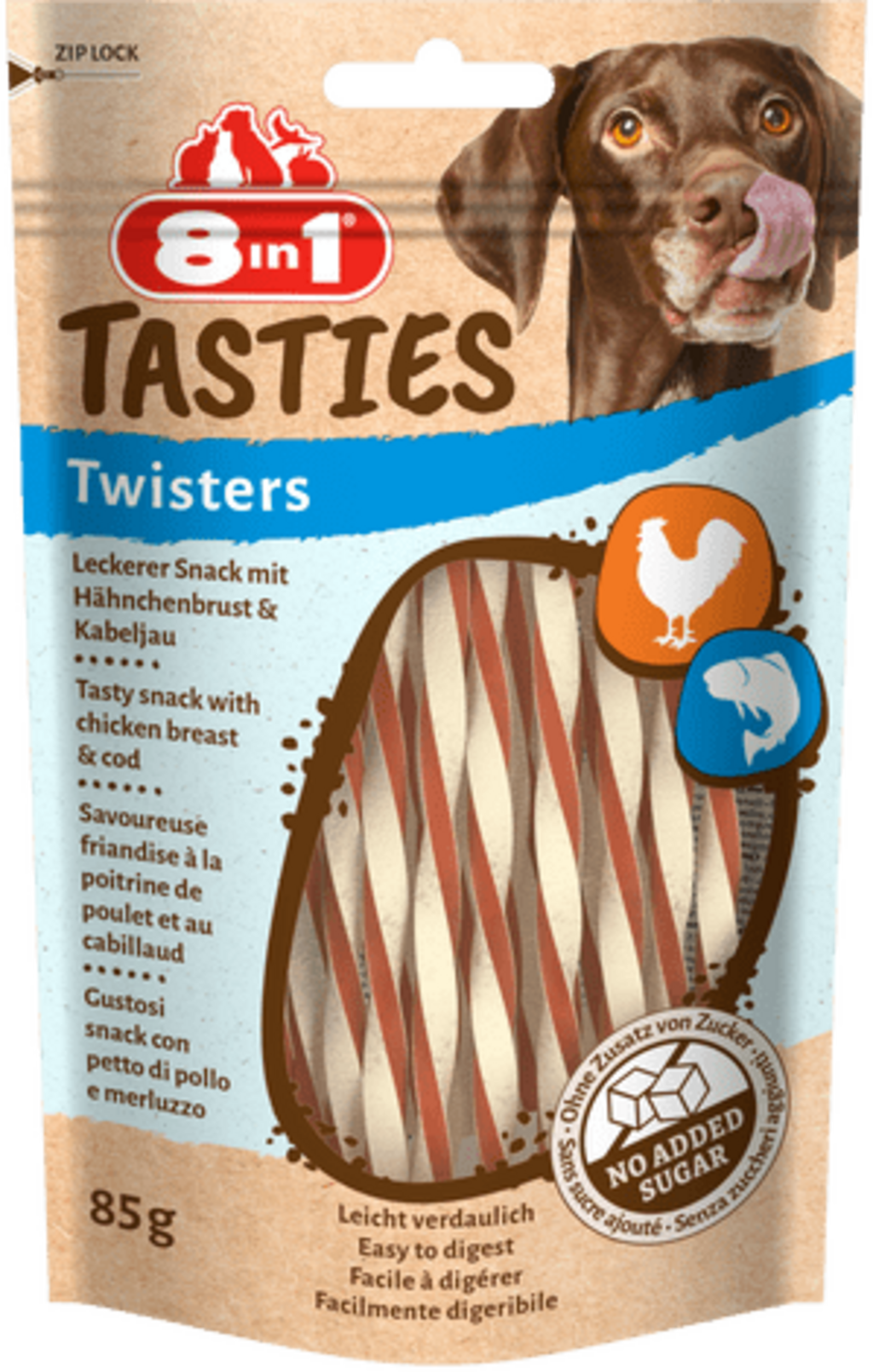 Délicieux, irrésistibles... les Tasties Twisters de 8in1 ! Ces récompenses bénies contiennent un savoureux blanc de poulet et du bon cabillaud magnifiquement torsadés ! Cette friandise riche en protéines est facile à digérer, ne contient pas de sucres ajoutés et est pauvre en matières grasses. Cuite au four, elle ne contient pas de gluten, d'exhausteurs de goût, d'organismes génétiquement modifiés, de conservateurs artificiels ni de colorants. Tout simplement délicieux !